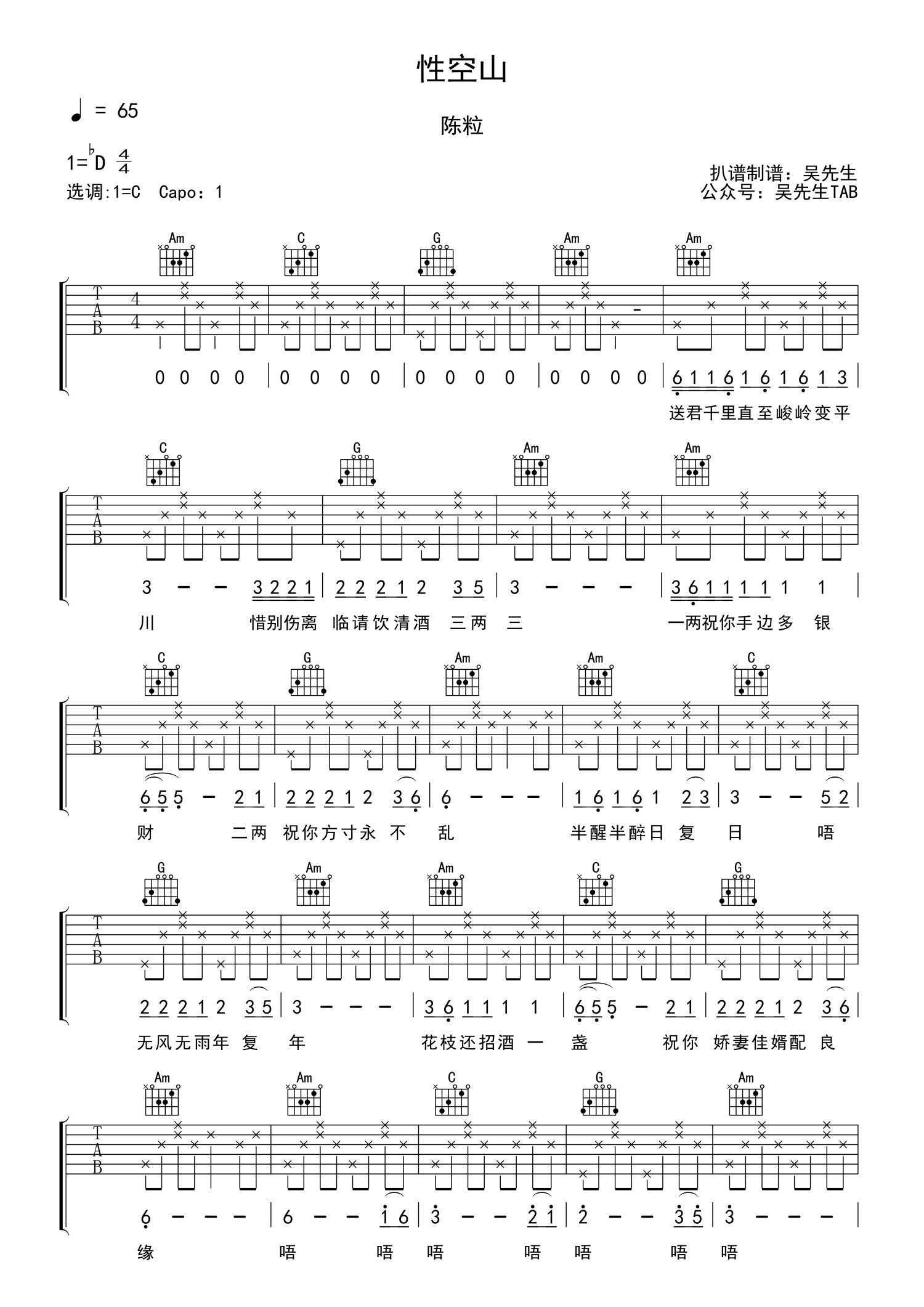 曲谱介绍: 性空山吉他谱,歌曲原调bD,选用C调指法,capo夹一品,《性空山》这首歌陈粒用一种知性的哭腔搭配她恰到好处的转音技巧,漫不经心的吟唱,使人感到一份无法言说的悲情,贪恋、执着,由浅入深,百转千回。陈粒唱歌经常像是大声的对着一个人倾诉、嘶喊,无意间撩动听众的感情是她最擅长的杀手锏。