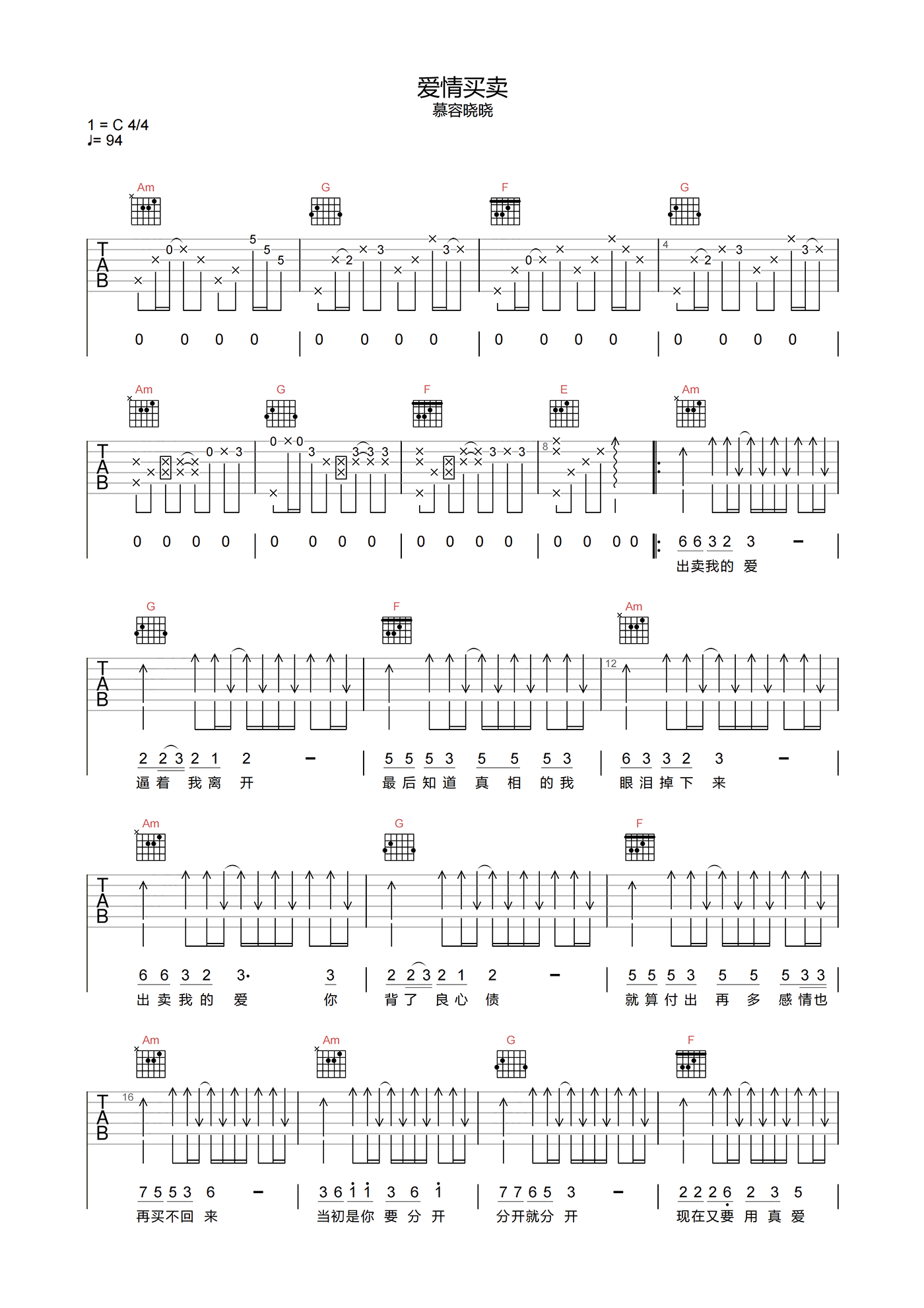 曲谱介绍: 爱情买卖吉他谱分享,由慕容晓晓演唱的网络伤感情歌。《爱情买卖》吉他弹唱谱,选用C调,速度94拍每分钟,节奏4/4拍,带前奏原版编配,共3张高清图片谱例,难度3级较简单,随谱页面下方附PDF下载。 简单的歌词,洒脱的曲风,唱着爱情里的感情“出卖”,确实如此,爱情并非买卖,更多的付出,是由心的,是无价的。所以歌曲反面的方式告诉我们应当珍惜来自不易的感情关系。