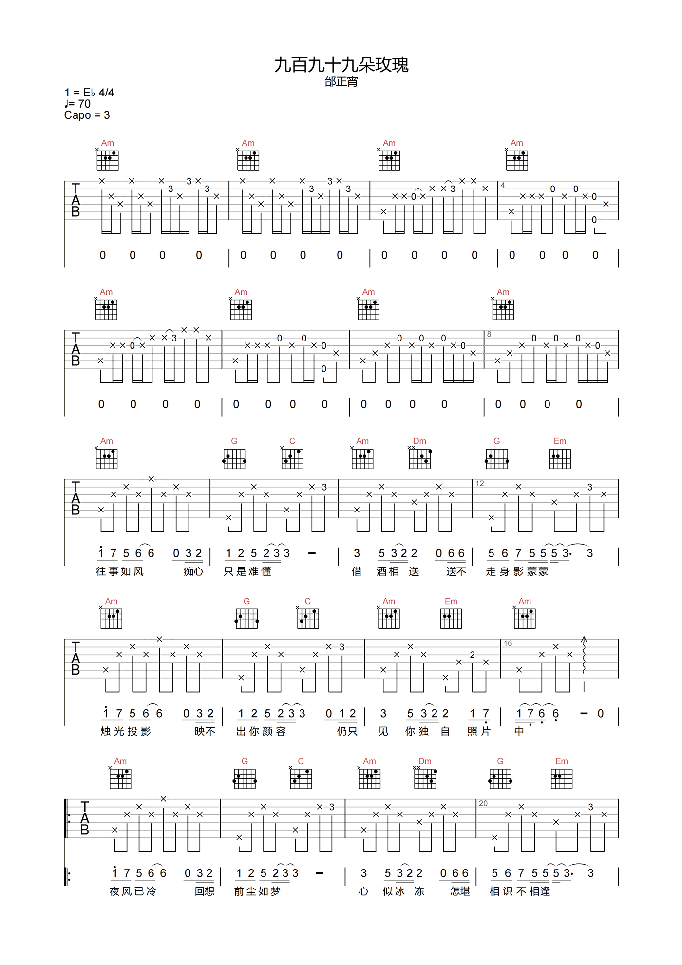 曲谱介绍: 九百九十九朵玫瑰吉他谱,是由邰正宵演唱的一首经典老歌。《九百九十九朵玫瑰》吉他弹唱谱,选用C调指法,原调bE,CAPO夹3品可弹回原调,速度70拍每分钟,拍号4/4,带前奏超原版编配,难度3级较简单。 这首歌的初衷,是为了鼓励一位绝症女孩。为了鼓励女孩,邰正宵每天都会给她送一束鲜花,可惜女孩最终还是离开人世。也许我们后知后觉,但歌曲无论多年,都已经深深感染了我们。