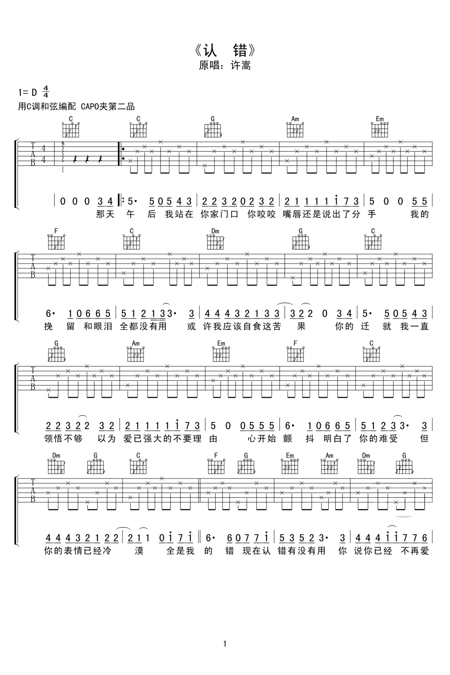曲谱介绍: 许嵩《认错》吉他谱,歌曲原调D,采用C调和弦编配,弹奏时候变调夹夹第二品,许嵩的《认错》,是最动人的情歌,只为挽回心上人,一首能让人听到心碎的伤感情歌,它的每一句歌词叙写的内容都是那么真实,那么贴近每一个的内心,使人一听就融入了歌的情境之中。有情感经历的人听这首歌一定会有共鸣~