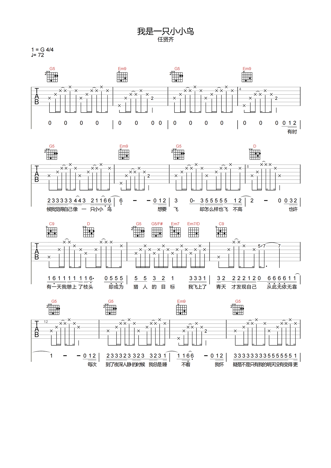 我是一只小小鸟吉他谱 - 任贤齐 - G调吉他弹唱谱 - 原版