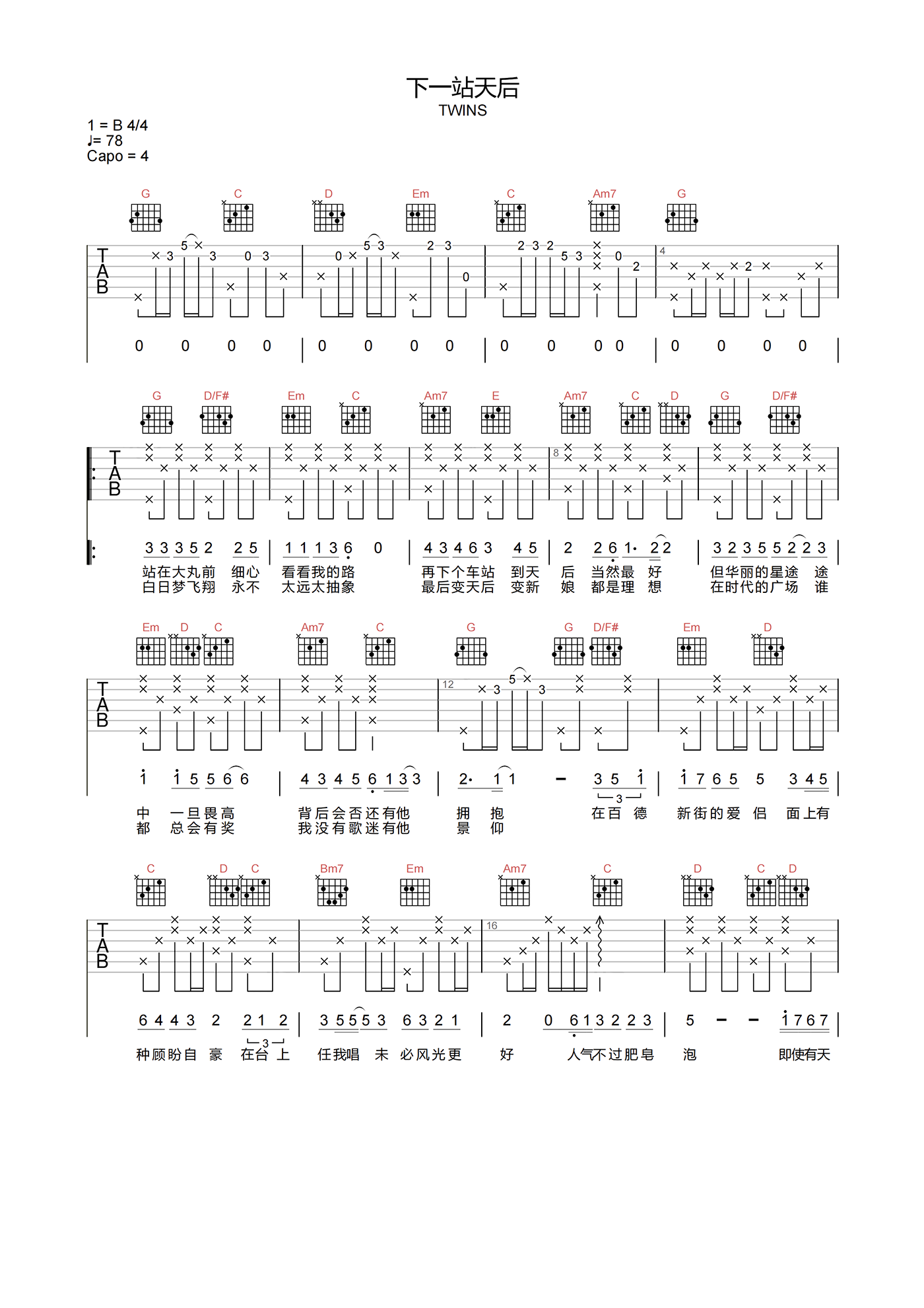 曲谱介绍: 下一站天后吉他谱分享,由TWINS演唱,《下一站天后》吉他弹唱谱,选用G调指法,原调B调,速度78拍每分钟,节奏4/4拍,共有3张高清六线谱图例,难度3级较简单,带前奏超原版编配,下方附曲谱PDF下载。 细声轻柔地吟唱,温馨甜美的曲调传到内心深处,多少难忘的岁月,唤醒了许多人的追忆。陪伴80,90后青春记忆,我们依然将歌声永存于心,下一站依然等你。