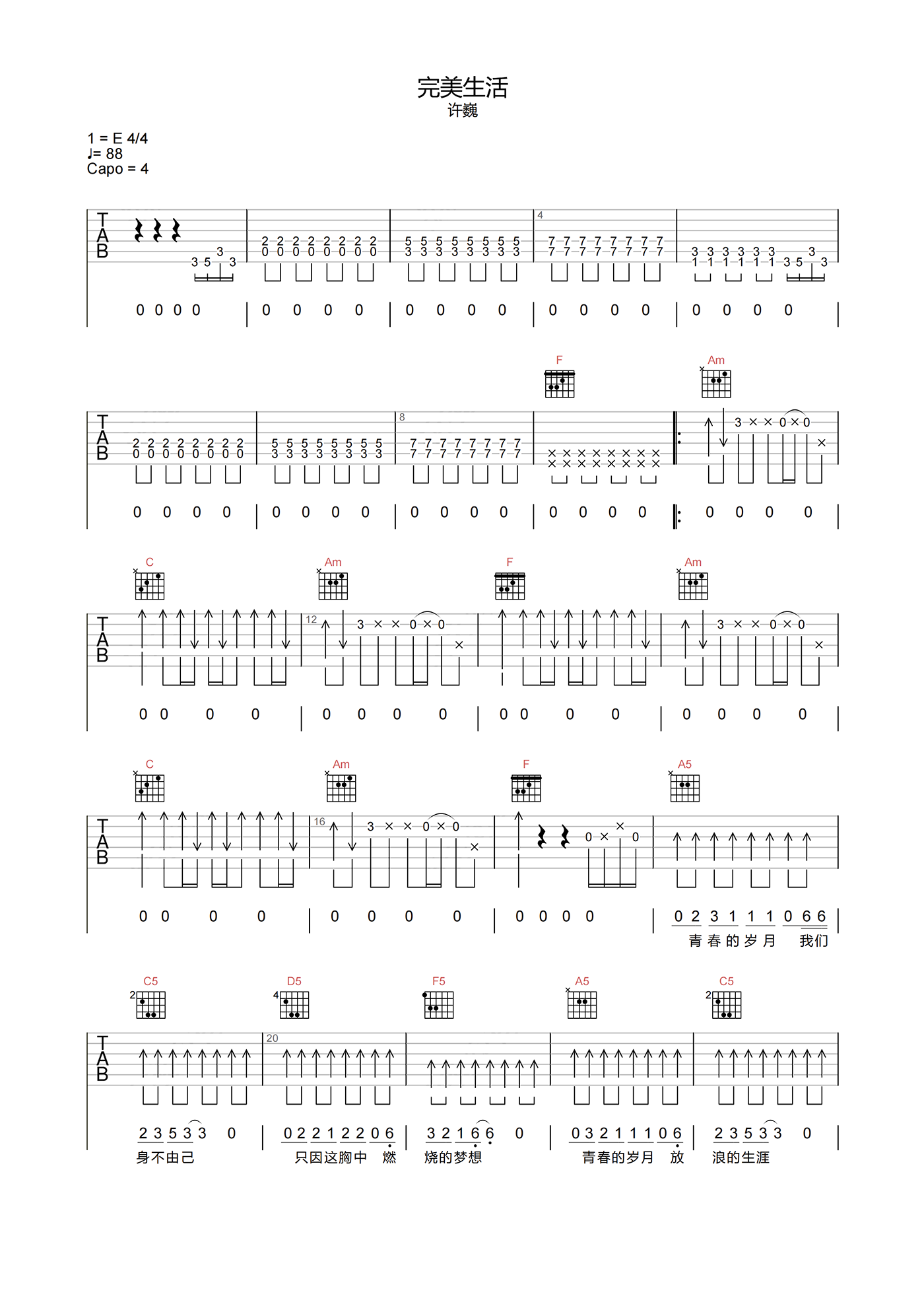 曲谱介绍: 《完美生活》吉他谱,许巍演唱的歌曲,《完美生活》吉他弹唱谱,选用C调指法,原调E调,速度控制88拍每分钟,节奏4/4拍,难度5级适中,带前奏精细原版编配,下方附本曲谱的PDF下载。