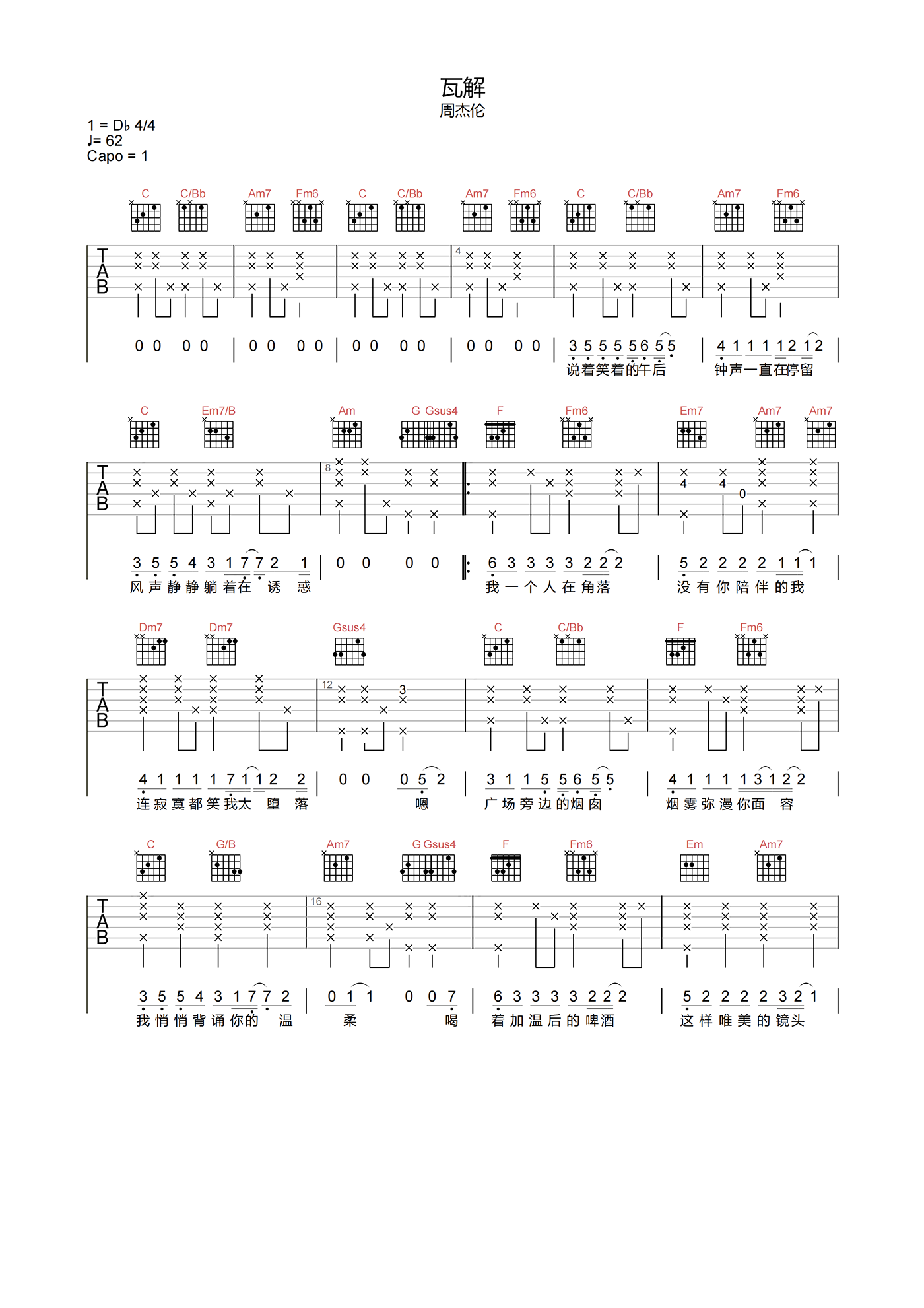 曲谱介绍: 瓦解吉他谱,周杰伦创作并演唱。《瓦解》吉他弹唱谱,选用C调指法,原调bD,CAPO夹1品弹唱原调,速度62拍每分钟,带前奏完整原版编配,难度3级较简单。下方附曲谱PDF下载。 原本自己很满意的一首歌曲,后赠给南拳妈妈使用,不过杰伦演唱的版本,在他众多曲目当中虽然小众,但喜欢的人会深深喜欢。慵懒的演唱曲风,实在是捕获人心。