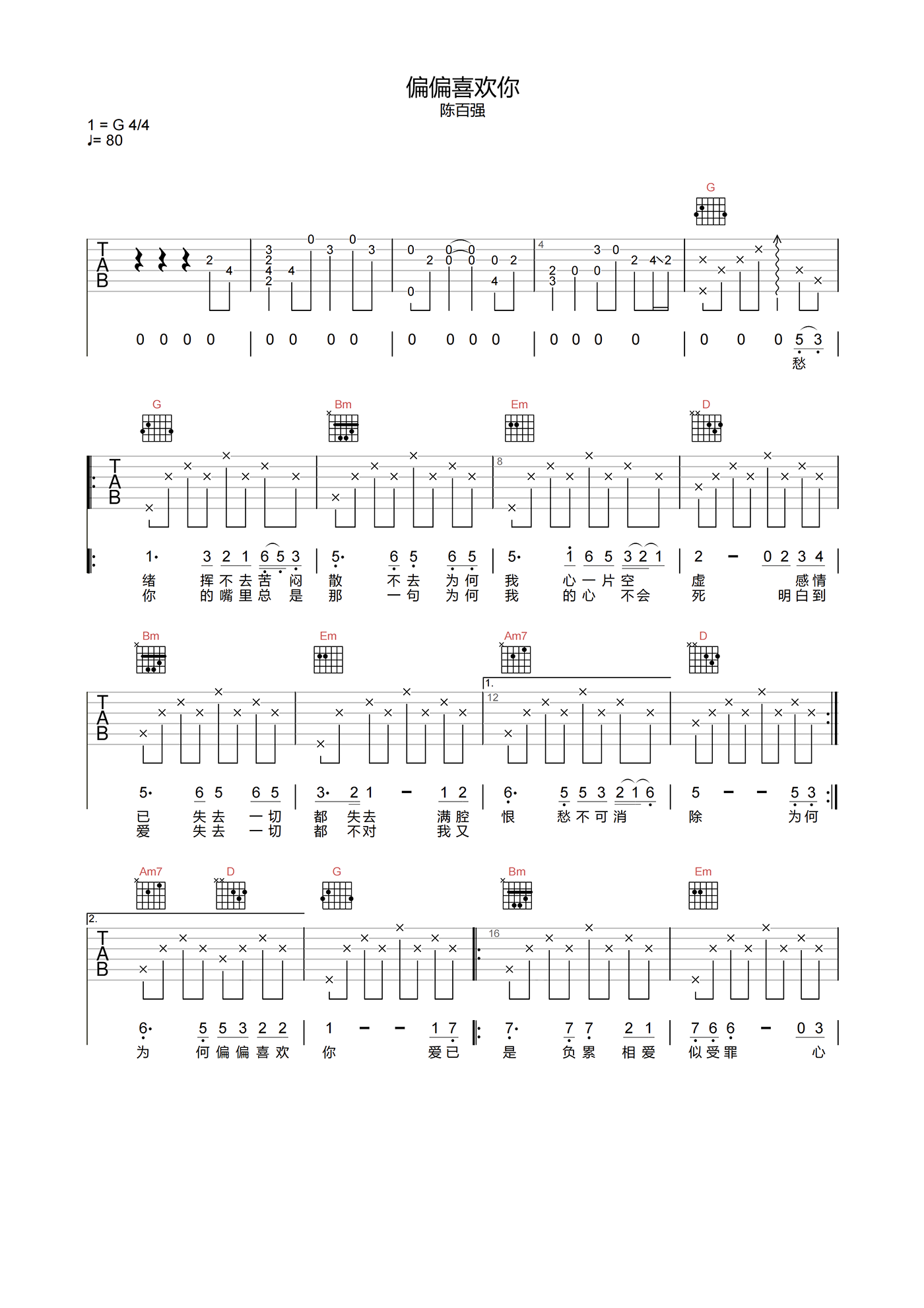 曲谱介绍: 偏偏喜欢你吉他谱分享,由陈百强演唱的粤语歌曲,《偏偏喜欢你》吉他弹唱谱,选用G调指法,原调编配无需使用变调夹,带完整前奏,难度3级较简单,下方附本曲谱PDF下载。
