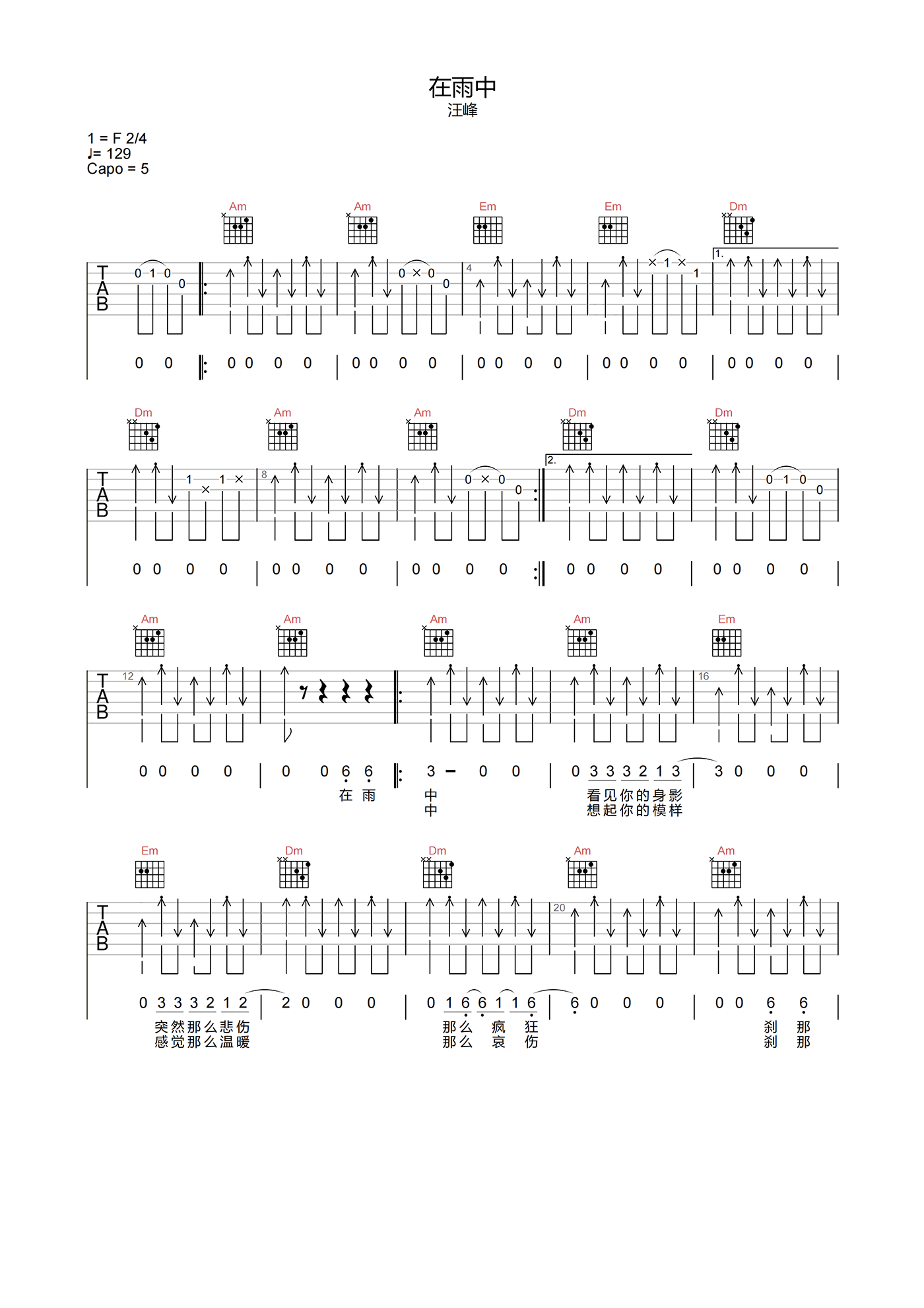 曲谱介绍: 《在雨中》吉他谱,由汪峰演唱的一首歌曲,《在雨中》吉他弹唱谱,选用C调指法,原调F调,速度控制在129拍每分钟,节奏2/4拍,CAPO建议夹5品弹唱原调,原版编配,下方附本曲谱的PDF下载。 迷幻慵懒的柔情嗓音,唱着男人心中对爱的那份执着与渴望,哀伤的调调,让我们随着音乐无比的怀念着过去逝去的爱情,随着雨滴的冲刷,让我们慢慢完全忘掉吧…