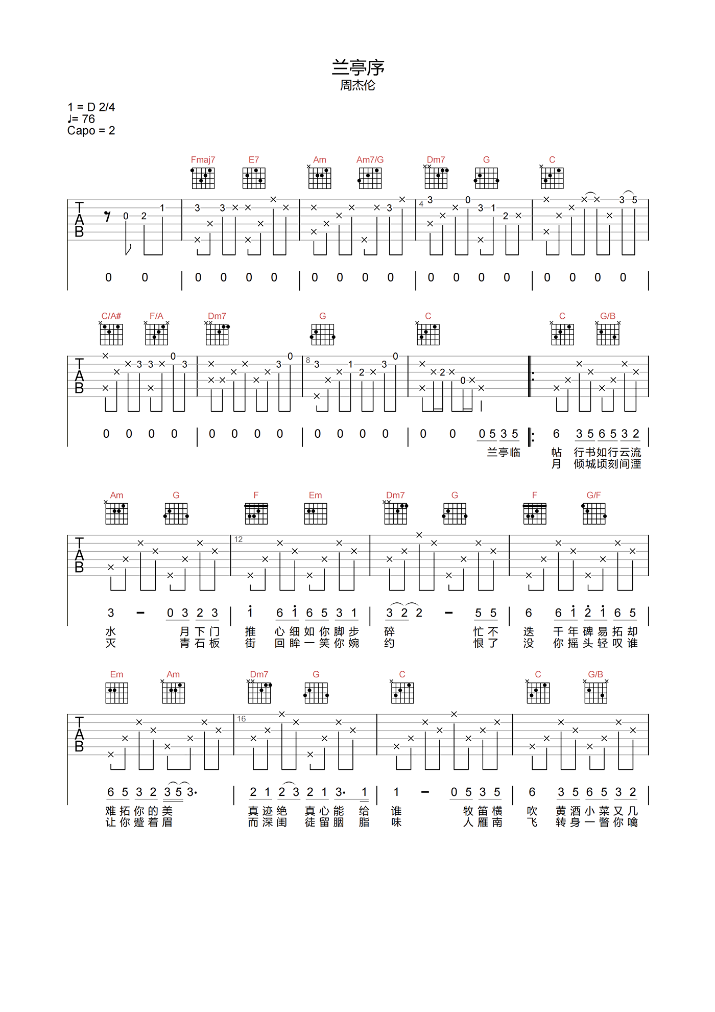 曲谱介绍: 兰亭序吉他谱,周杰伦演唱。《兰亭序》吉他弹唱谱,选用C调指法,原调D调,节奏2/4拍,速度76拍每分钟,带前奏原版编配,难度3级较简单,下方附曲谱PDF下载。 曲调悠扬,韵味深长,是歌亦是词,絮絮念念,哼起一段京剧小旦唱腔,问情字何解,只能一遍遍地临摹兰亭序,以期望能窥见一抹历史中的真绝色。
