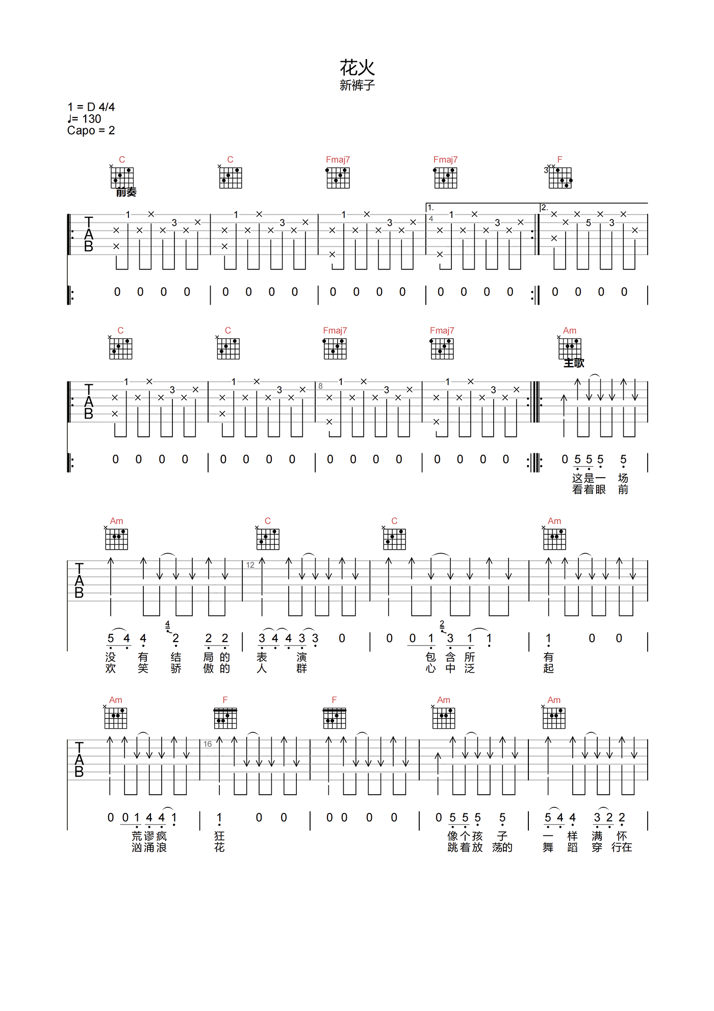 花火吉他谱 - 新裤子 - C调吉他弹唱谱 - 原版