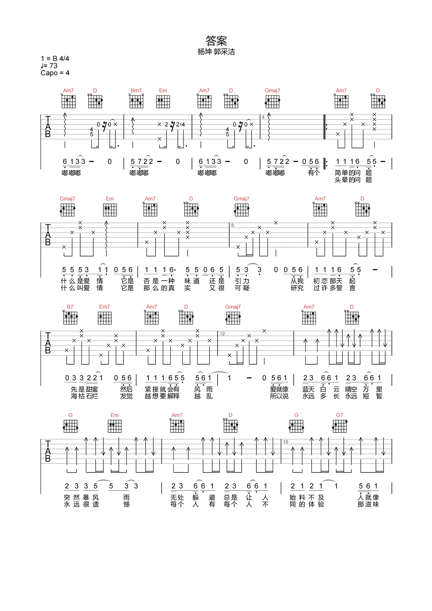 曲谱介绍: 答案吉他谱,由杨坤/郭采洁合唱的轻快歌曲。《答案》吉他弹唱谱,选用G调指法,原调B调,速度73拍每分钟,节奏4/4拍,精编原版,难度5级适中。 《答案》保留了歌曲轻快的节奏,但在整首歌曲的表达意境上,感情总让人捉摸不定,我们总想在人生大事得到满意的答案,甚至在人生这条道路上,我们每个人也都是寻找答案的旅人,