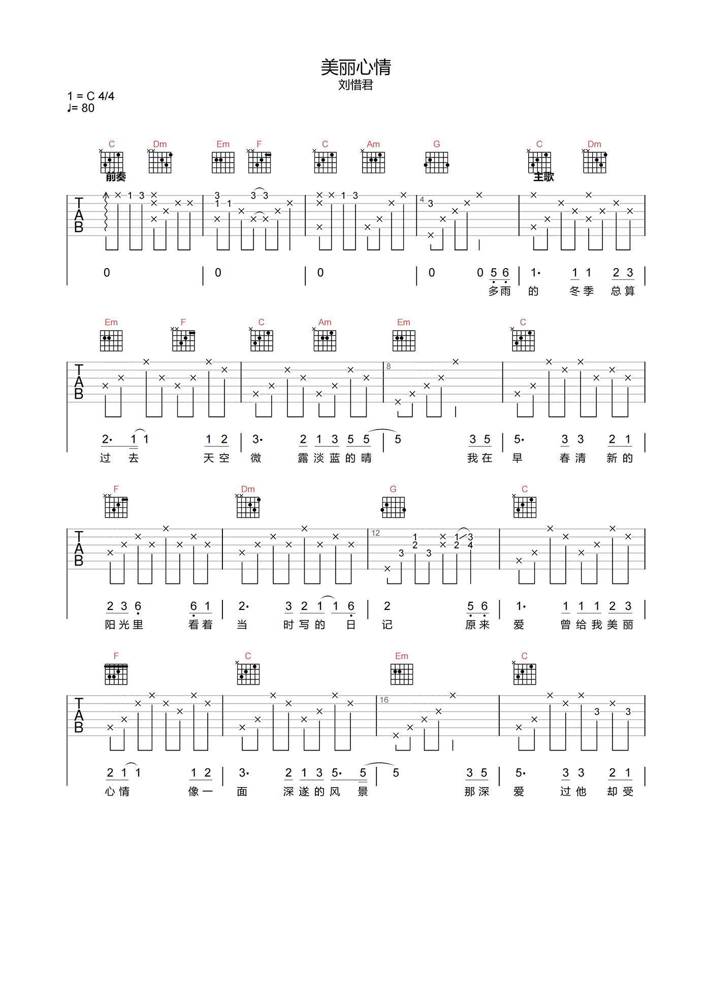 美丽心情吉他谱 - 刘惜君 - C调吉他弹唱谱 - 原版