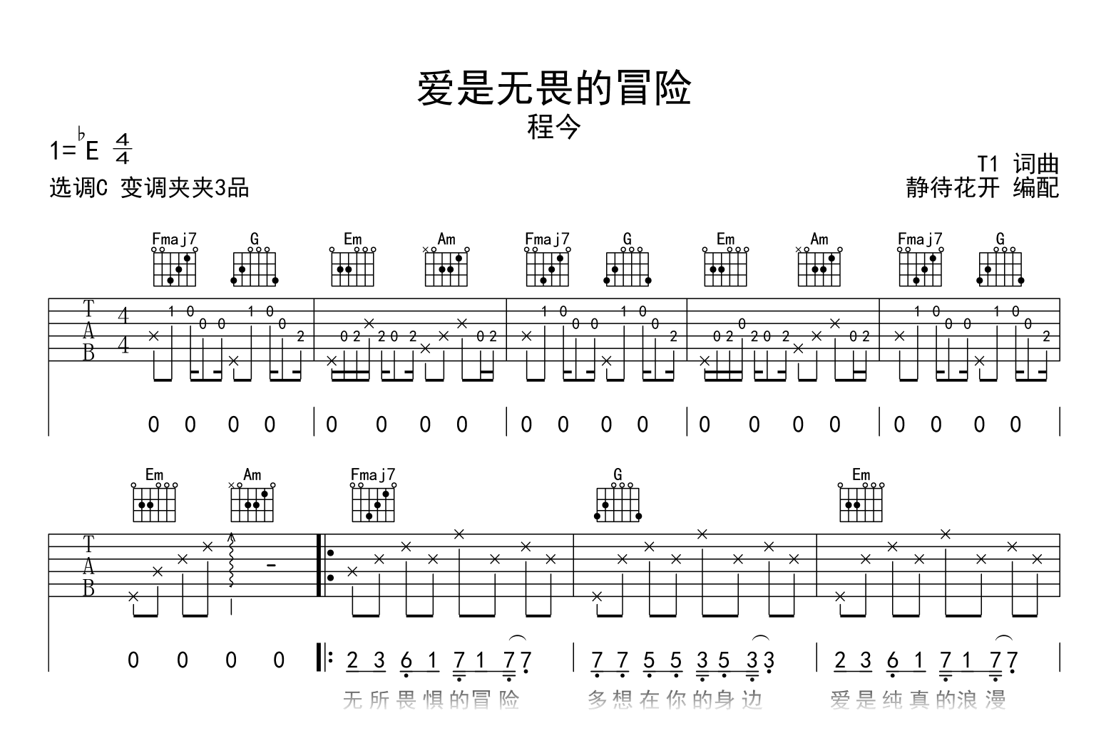 曲谱介绍: 爱是无畏的冒险吉他谱,程今演唱,《爱是无畏的冒险》他弹唱谱,编配制作采用C调和弦指法,原调bE调,推荐变调夹夹3品,也可以根据嗓音情况选择变调夹,适合自己音高即可,速度大概每分钟85拍,整体难度简单。