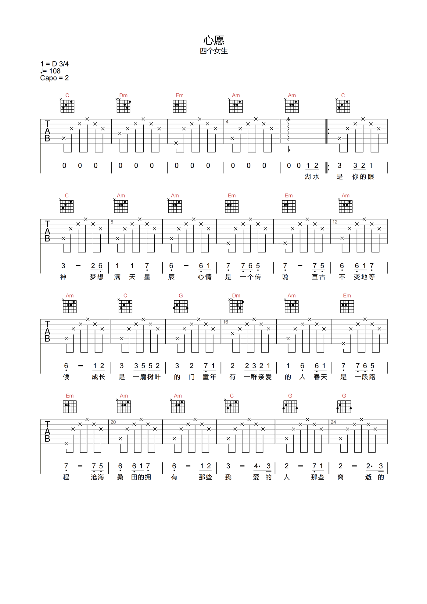 曲谱介绍: 心愿吉他谱分享,四个女生演唱,《心愿》吉他弹唱谱,选用C调指法,原调D调,CAPO夹2品可弹唱原调,节奏拍号3/4拍,速度108拍每分钟,弹唱难度2级简单,新手也可很好上手。 这首歌的歌词尽管非常简单,旋律也很平淡,但却拥有了一种浓浓的属于时光的味道,属于那段我们后来才知道是人生中最美好也最遗憾的时光。而这,或许正是很多人多年以后还能依旧喜欢这首歌的真正原因。