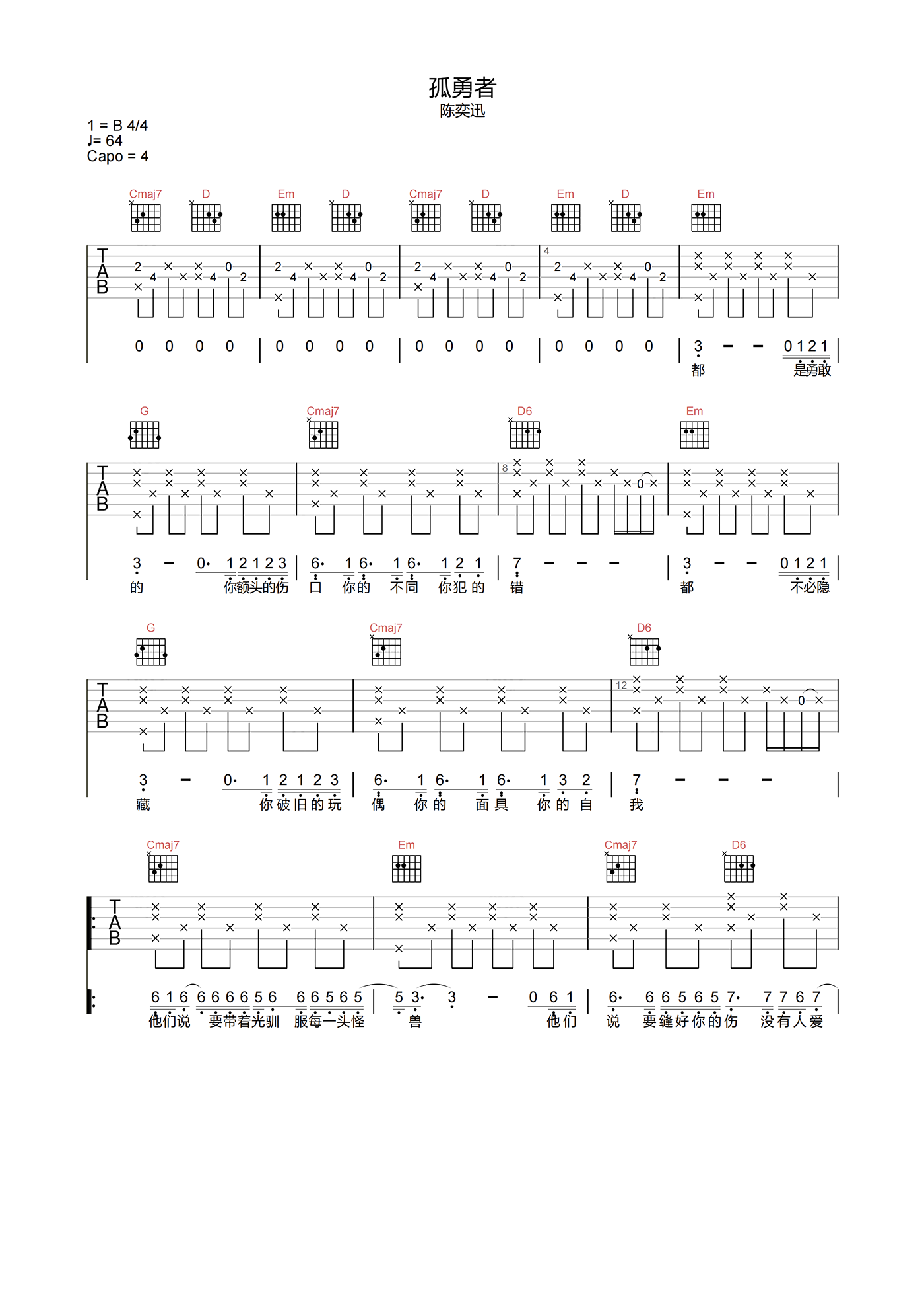 曲谱介绍: 孤勇者吉他谱分享,陈奕迅演唱的《英雄联盟》动画主题曲,《孤勇者》吉他弹唱谱,选用G调指法,原调B调,变调夹建议夹4品弹唱原调,带前奏原版编配,节奏拍号4/4,速度64拍每分钟,难度3级较简单,下方附本吉他谱的PDF瞎子啊。 洒脱的曲风充满了无穷的力量感,从创作角度将勇者、光明、英雄、挑战体现得淋漓尽致,孤胆与壮阔,勇者而立,“孤勇者”的形象也更加的立体,是我们每个人心中都认可的英雄。
