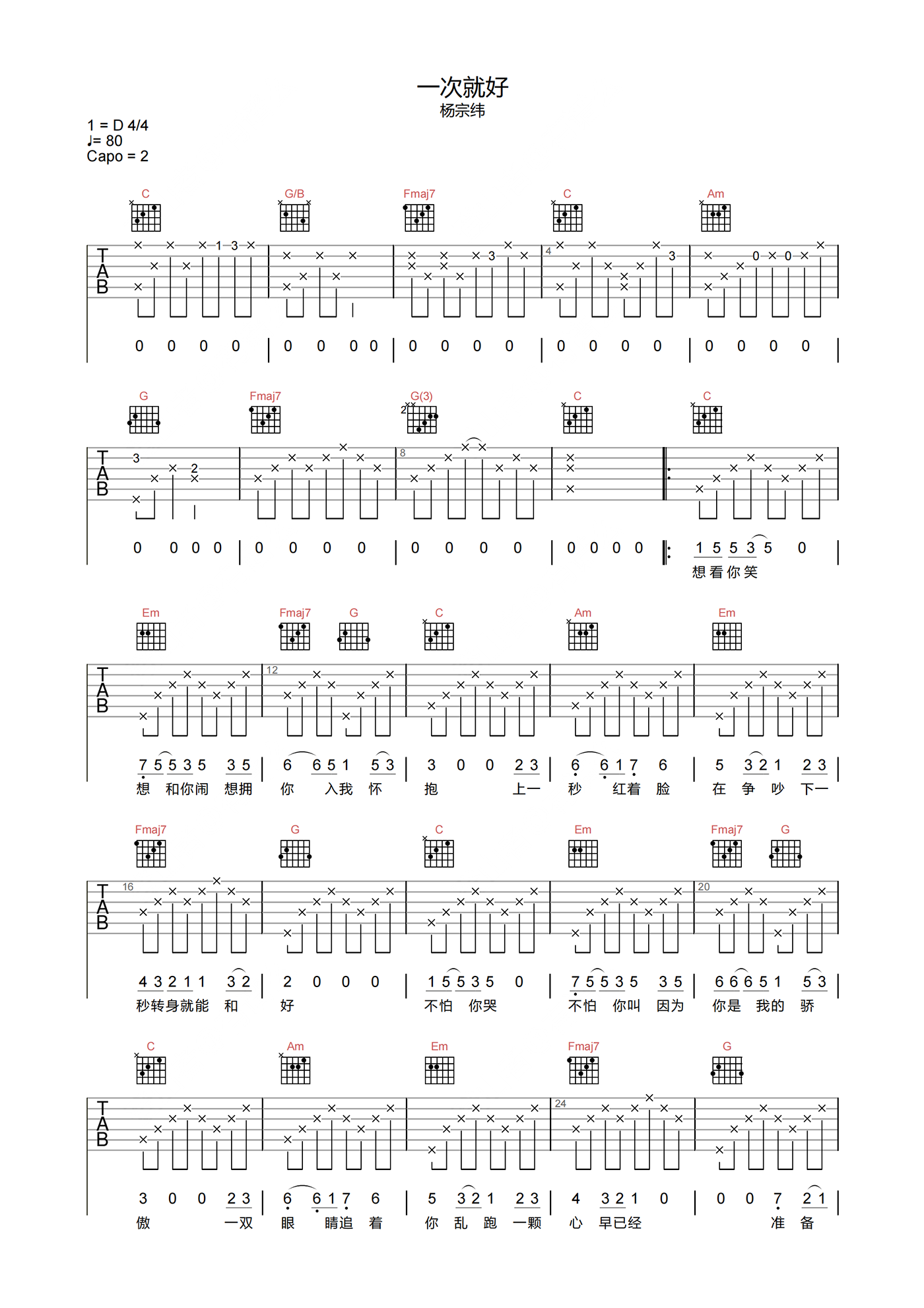 一次就好吉他谱 - 杨宗纬 - C调吉他弹唱谱 - 原版