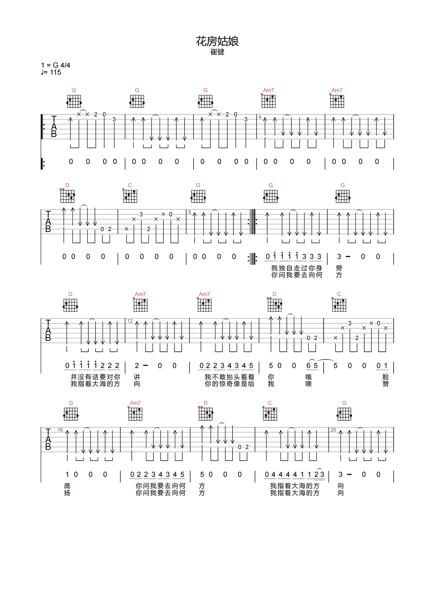 花房姑娘吉他谱 - 崔健 - G调吉他弹唱谱 - 原版
