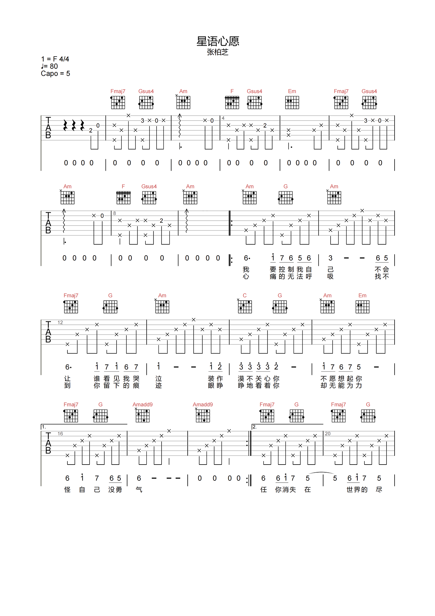 曲谱介绍: 星语心愿吉他谱,张柏芝演唱的一首歌曲,《星语心愿》吉他弹唱谱,选用C调指法,原调F调,速度控制在80拍每分钟,节奏拍好4/4,CAPO建议夹5品可弹回原调,男生可不用变调夹,带前奏按原版编配,难度3级较简单。 作为《星愿》电影的主题曲,这首歌时隔多年,每当音乐响起,感人画面依然历历在目。