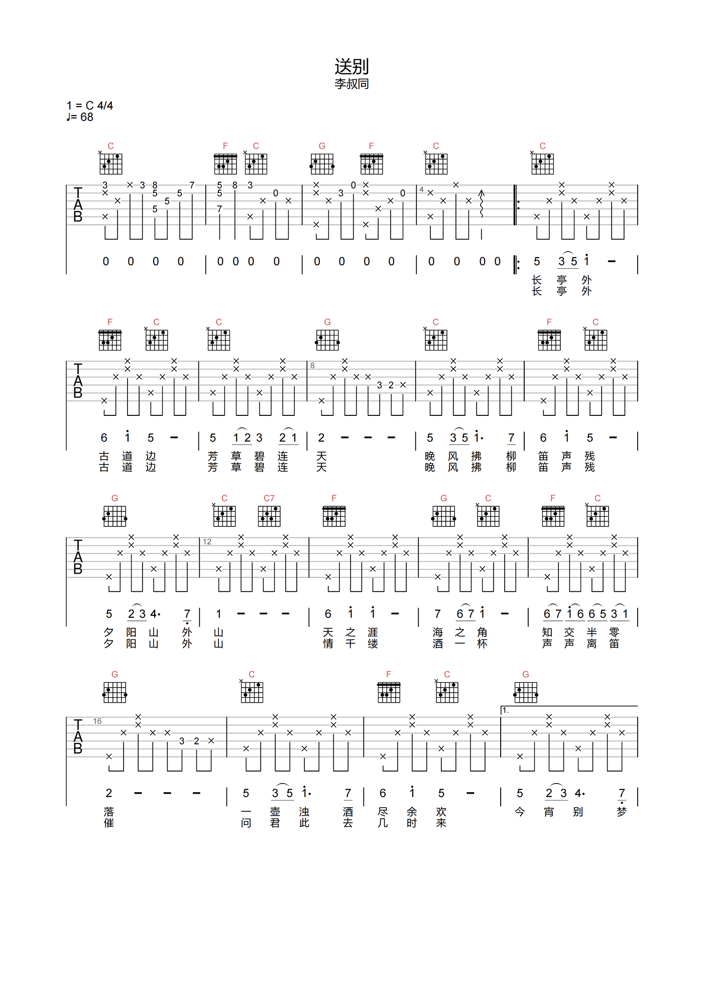 曲谱介绍: 送别吉他谱分享,李叔同演唱的一首民谣歌曲,《送别》吉他弹唱谱,选用C调指法,标准调音无需使用变调夹,原版原调编配,难度3级较简单,下方附本曲谱PDF下载。 简单的民谣,无论是BGM还是演唱却被反复重复了无数次,几乎无人不知,“长亭外,古道边,芳草碧连天”,淡淡的诗词蕴意着传统文化的不舍之情。