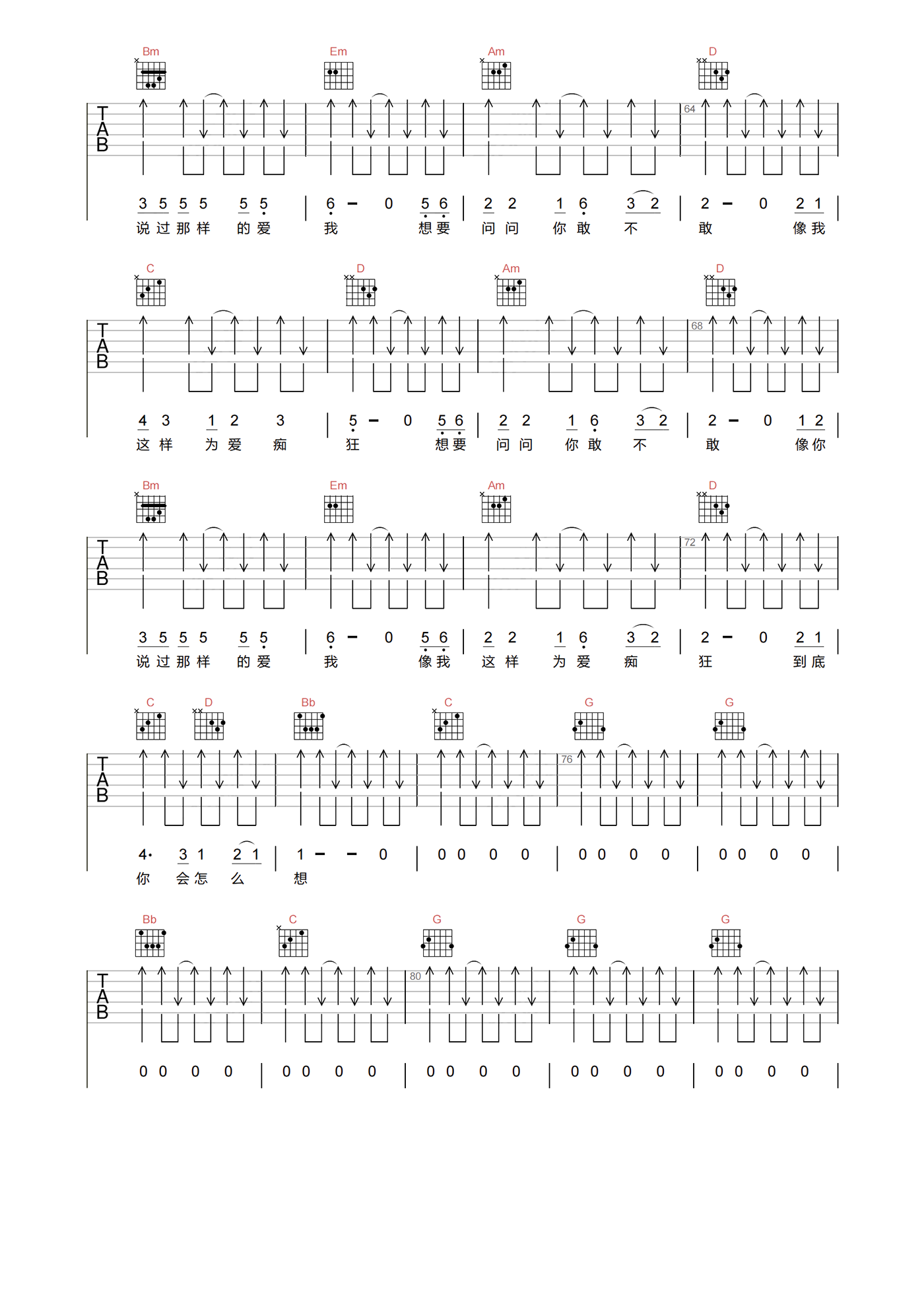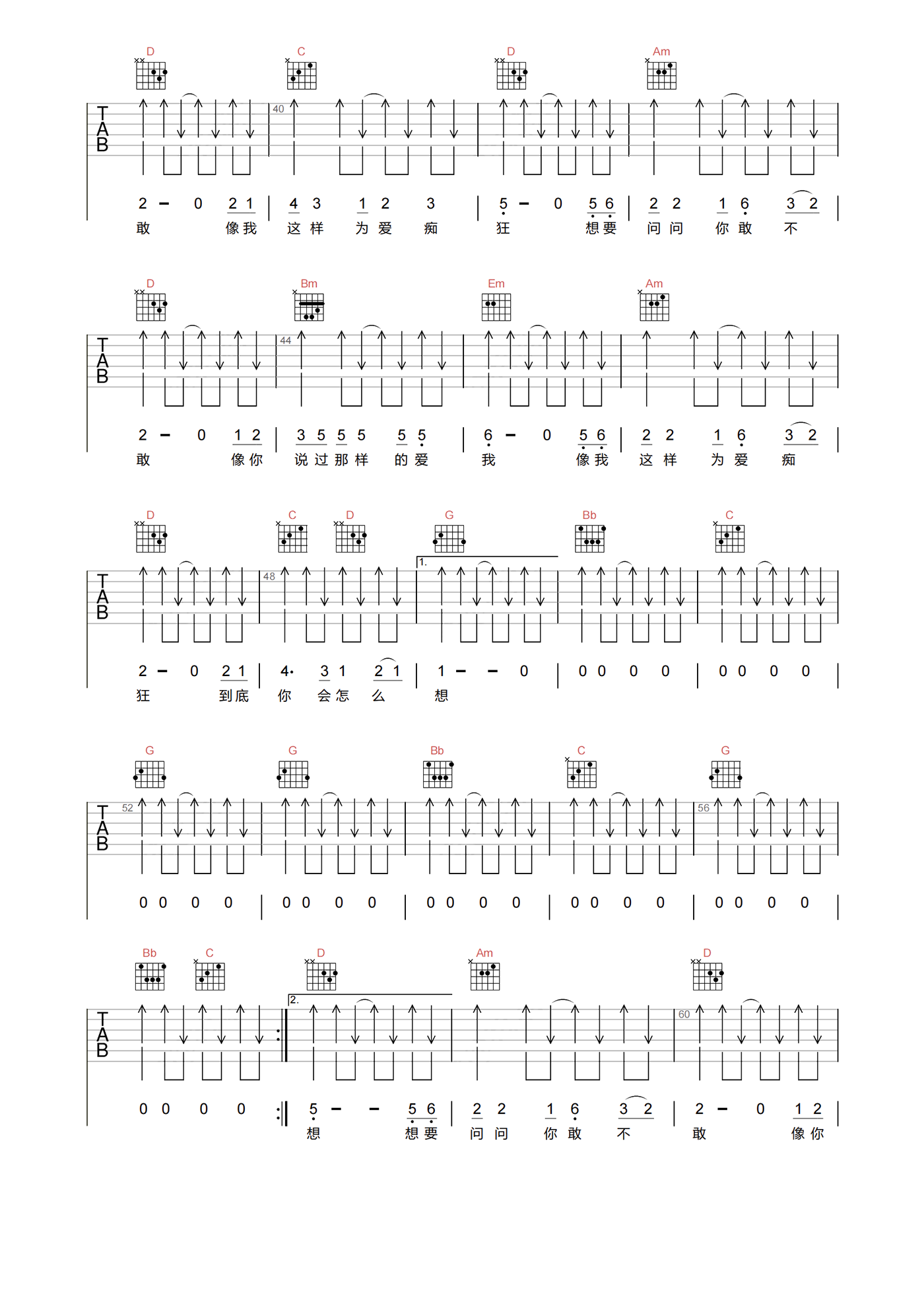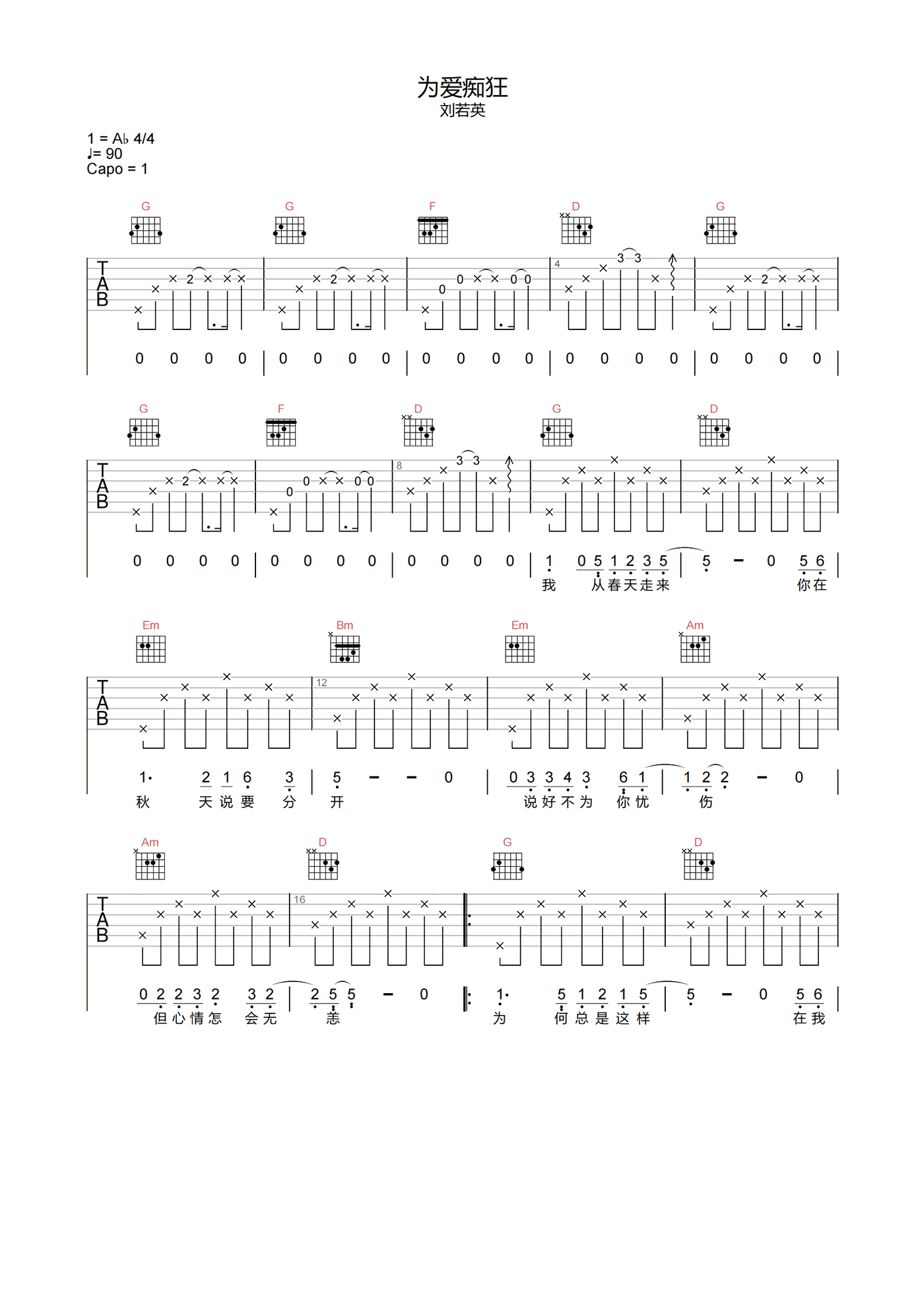 曲谱介绍: 为爱痴狂吉他谱分享,刘若英演唱的歌曲,《为爱痴狂》吉他弹唱谱,选用G调指法,原调bA,速度控制在90拍每分钟,节奏拍号4/4,带前奏原版编配,难度3级较简单,下方附本曲谱PDF下载。 敢爱敢恨,这首歌简单的歌词唱出了对爱的偏执,对过往的不舍,对爱情逝去的不甘。