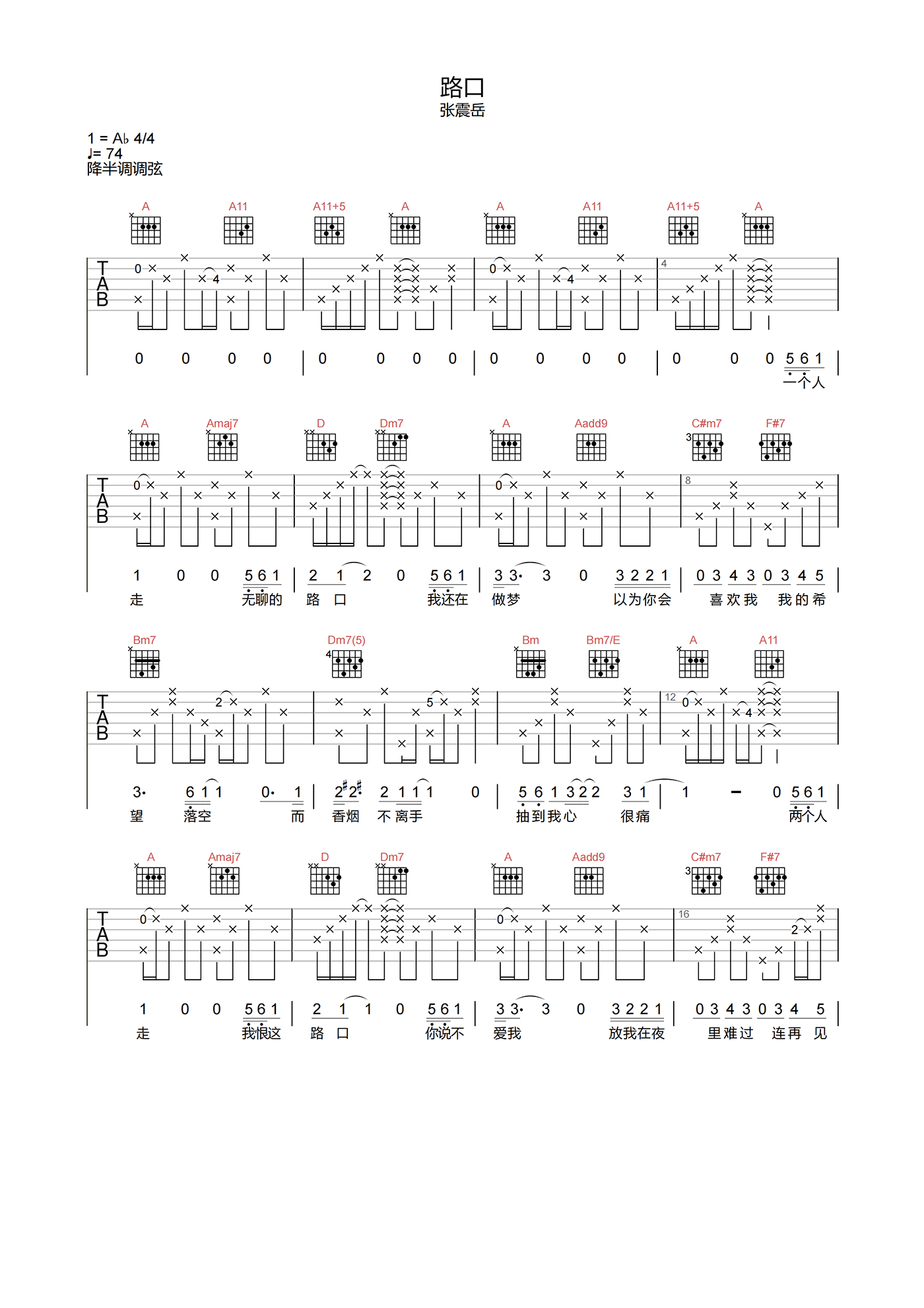 曲谱介绍: 路口吉他谱分享,张震岳演唱的歌曲,《路口》吉他弹唱谱,选用B调指法,原调bA,降半音调弦可弹回原调,带前奏的完整原版编配,难度3级较简单。