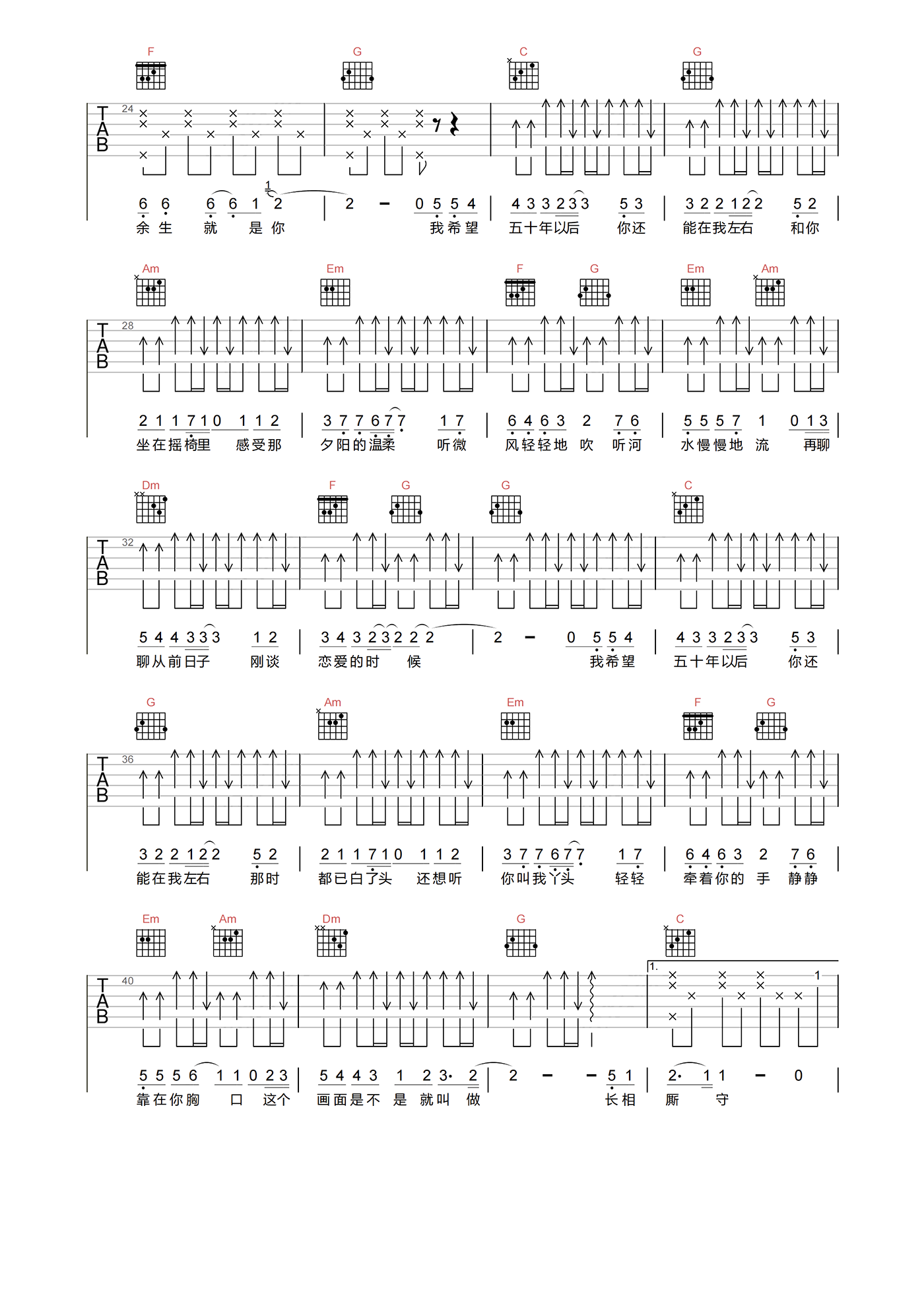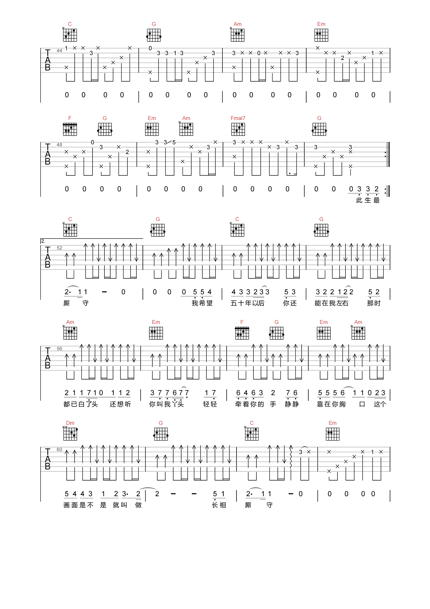 曲谱介绍: 五十年以后吉他谱分享,海来阿木演唱的一首感人情歌,《五十年以后》吉他弹唱谱,选用C调指法,标准调音无需使用变调夹,带前奏的完整原编配,难度3级较简单。下方附曲谱PDF下载。 温柔轻缓的弦乐,真挚感人的歌词,这首歌将长情浪漫表达得深入人心,世间缘分真的奇妙。