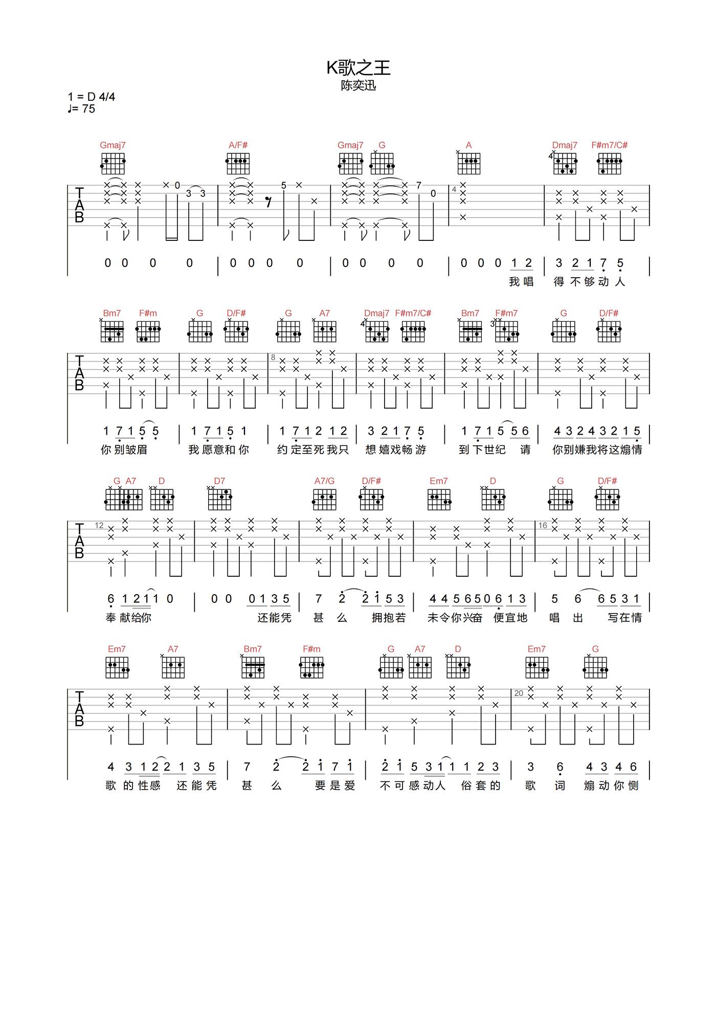 K歌之王吉他谱 - 陈奕迅 - D调吉他弹唱谱 - 原版
