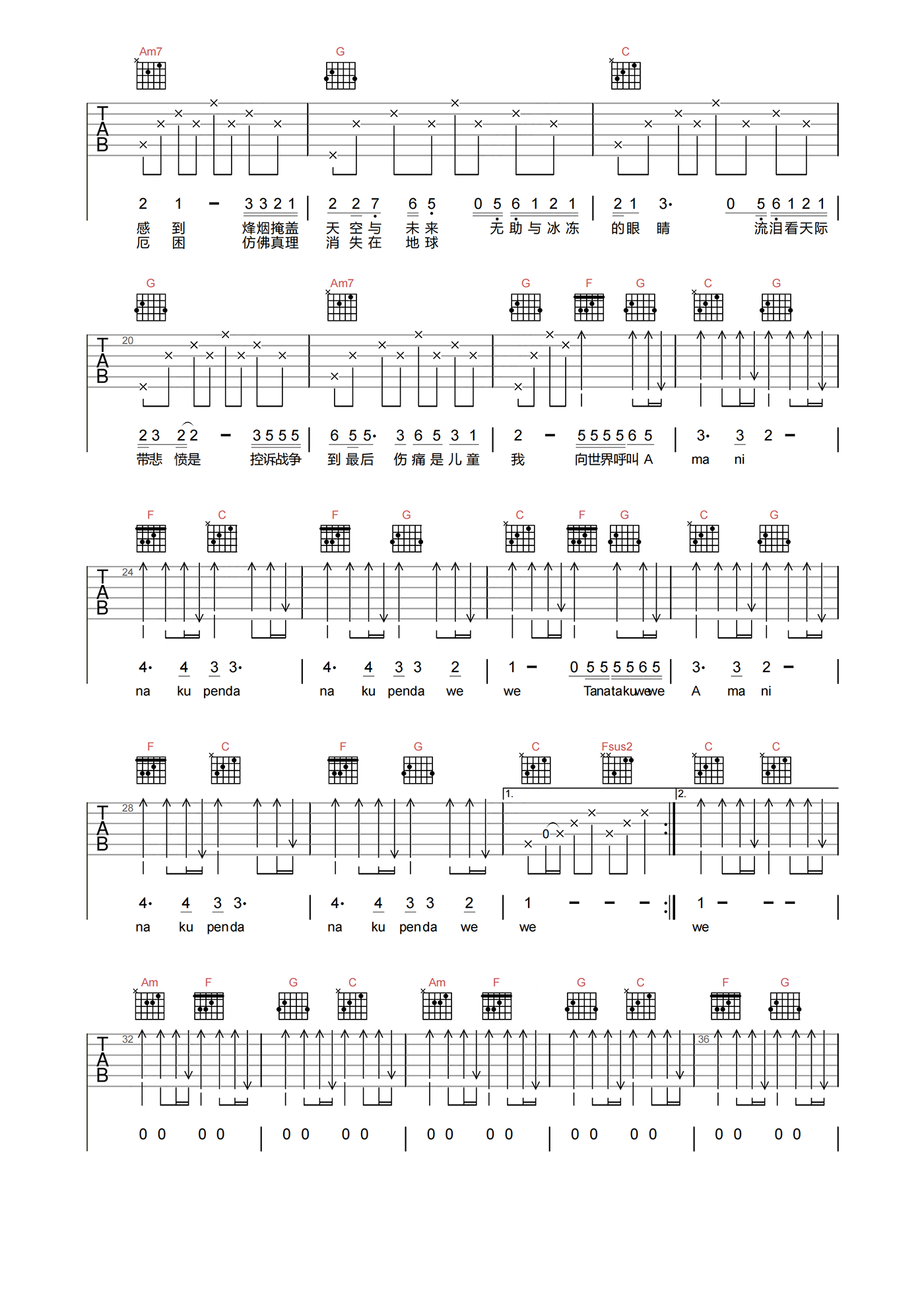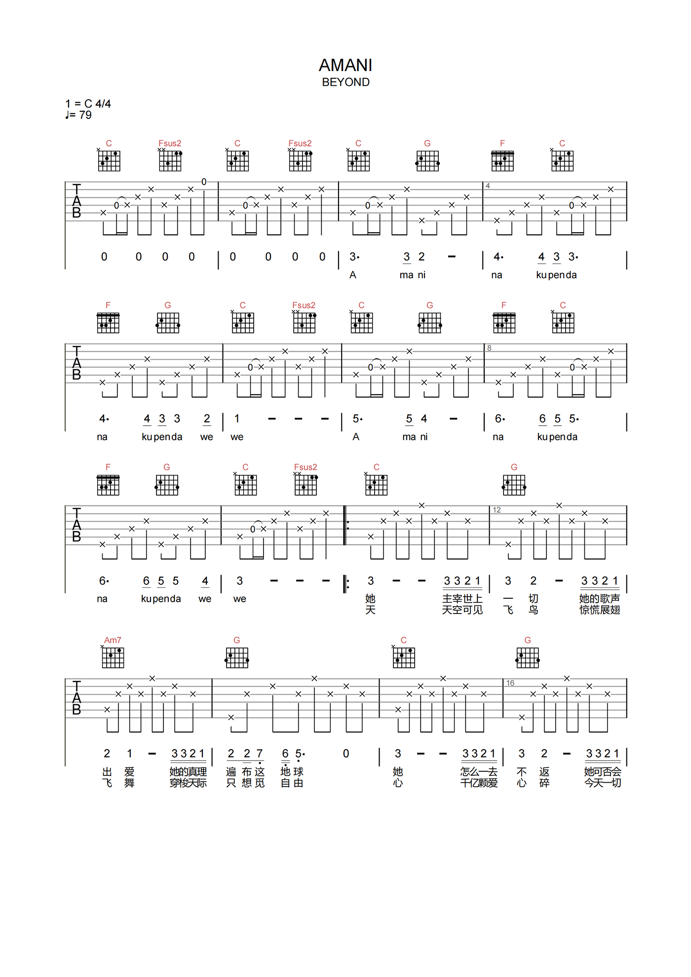 曲谱介绍: BEYOND《AMANI》吉他谱,选用C调指法,标准调音无需使用变调夹,节奏拍号4/4,速度79拍每分钟,共有4张高清吉他六线谱,难度3级较简单,本谱由琴谱网编辑整理上传。 歌曲诠释了黄家驹在非洲所闻所见,最终制作了这首呼吁和平的音乐。整曲反复重复大和平与爱的主旨,曲终的时候,那个小孩稍显风霜的稚嫩之声,直击内心,能在第一时间打动所有听众的心。