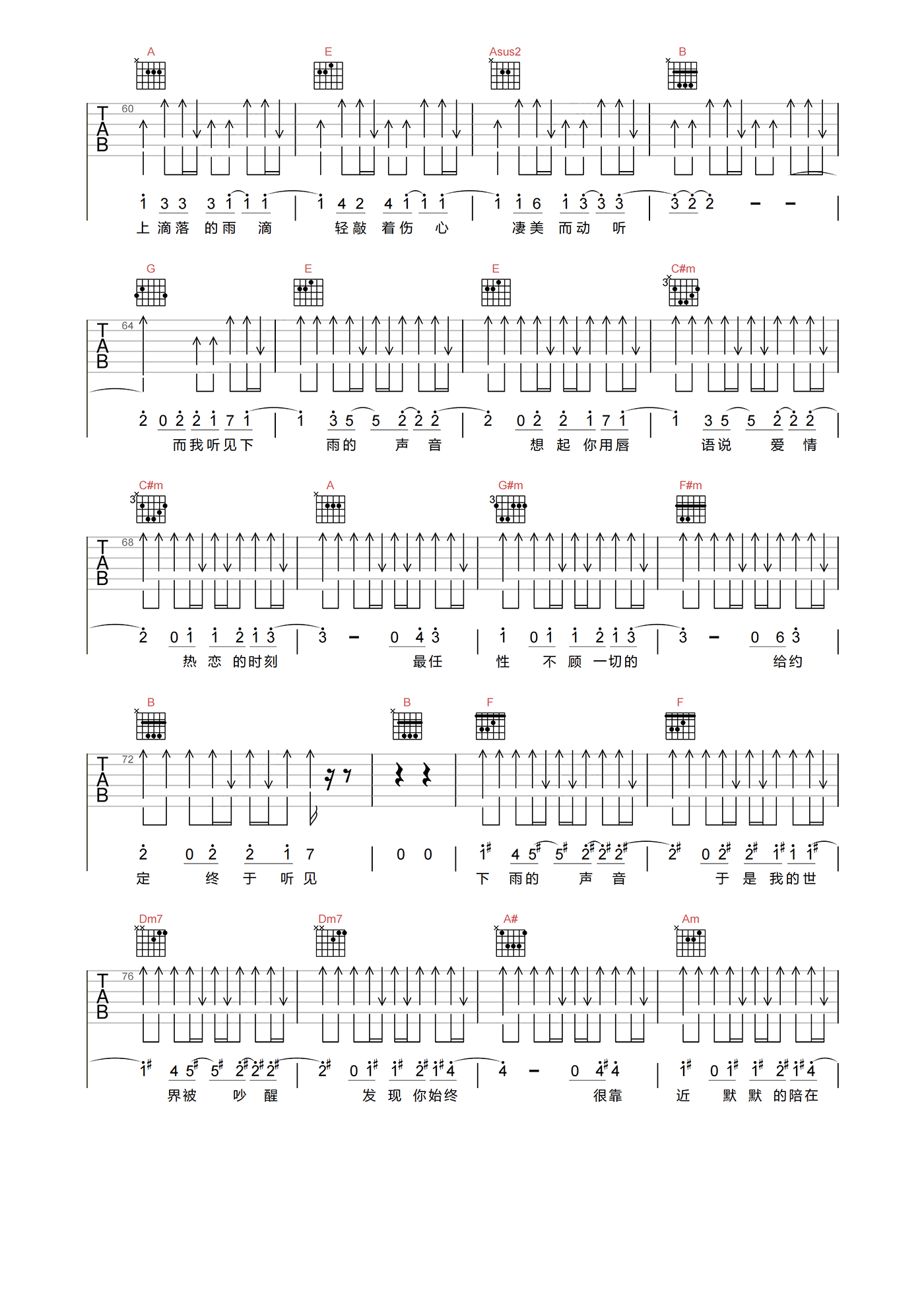 曲谱介绍: 听见下雨的声音吉他谱分享,周杰伦演唱的伤感情歌,《听见下雨的声音》吉他弹唱谱,选用E调指法,原调原版编配,节奏拍号4/4,速度86拍每分钟,弹唱难度3级较简单,下方附本曲谱PDF下载。 杰伦以低沉而寂寞的孤寂感吟唱着雨时的感伤,带著听者回到爱情的回忆现场,到了副歌,却彷佛在内心呐喊著对爱情的追忆与不舍,唱腔充满戏剧张力,令人动容!