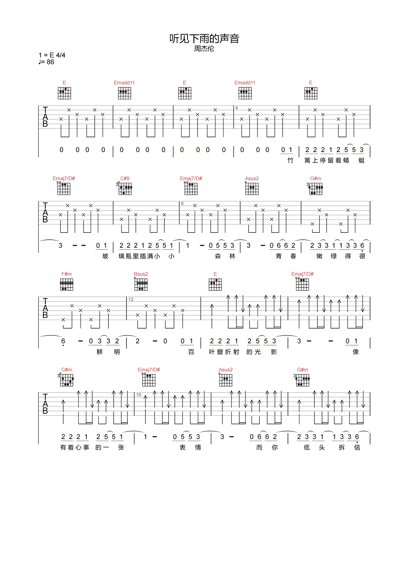 听见下雨的声音吉他谱 - 周杰伦 - E调吉他弹唱谱 - 原版