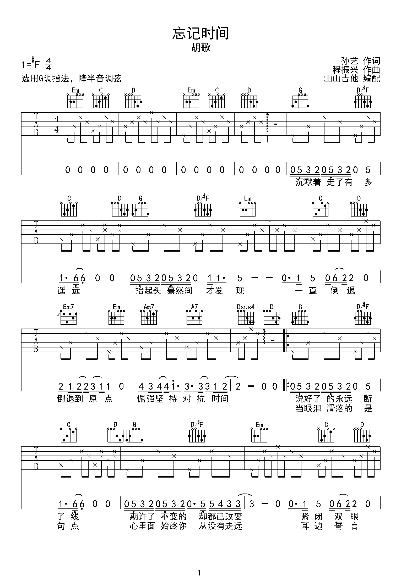 曲谱介绍: 胡歌《忘记时间》吉他谱,《仙剑奇侠传三》片尾曲,由山山吉他编配,选用G调指法,原调#F,弹唱原调需要降半音调弦,带前奏的原版六线谱,难度3级较简单,下方附曲谱的PDF下载,由琴谱网编辑整理上传。 胡歌演唱的这首歌刻画夕瑶对飞蓬上千年寂静的爱,龙葵对龙阳倾其所有的等待,一样令人感动。歌曲是一曲界面感十足的抒怀抒情曲。歌词里”慢慢地忘掉,忘记了时间,我只想要顺着的记忆线路”与《仙剑奇侠传三》的情节密切贴近。