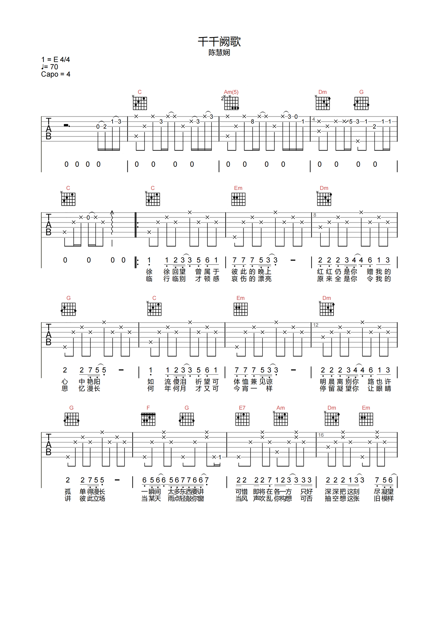 曲谱介绍: 陈慧娴《千千阙歌》吉他谱,选用C调指法,原调E调,变调夹建议夹4品弹唱,速度控制在70拍每分钟,节奏拍号4/4,带前奏原版编配,《千千阙歌》共有3张高清六线谱,难度3级较简单,由琴谱网编辑整理上传。 这首歌原本是改编自日本歌手近藤真彦的歌曲《夕阳之歌》,陈慧娴带着故事的嗓音,述说着将要分别的情绪,唱得荡气回肠之余,婉转之中亦不失少女情怀,一直是我们内心永驻的粤语经典。