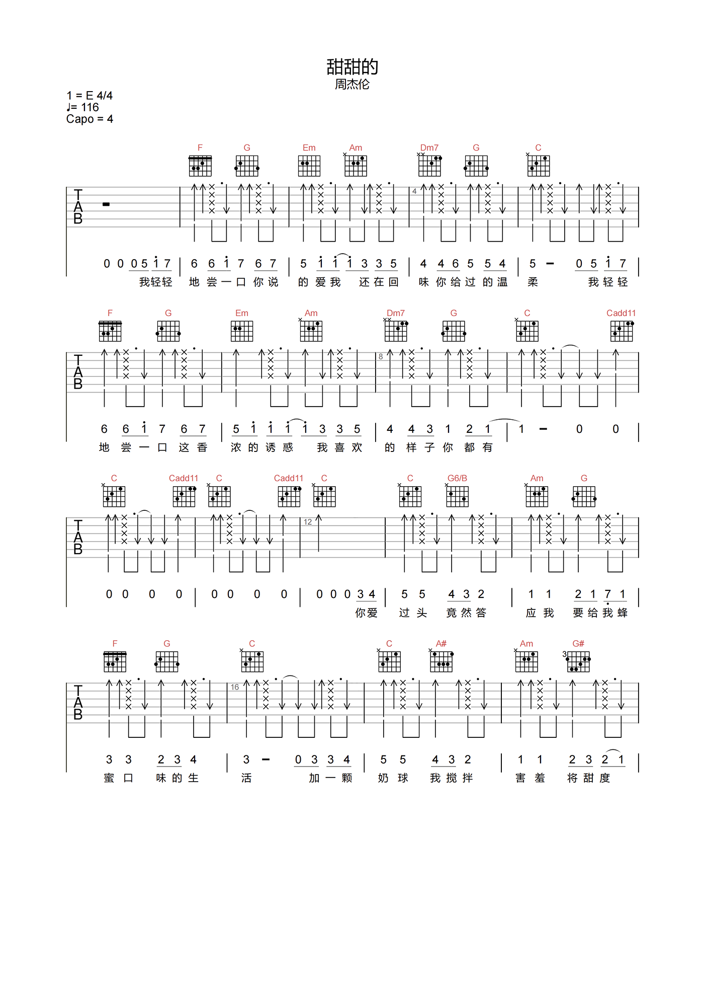 曲谱介绍: 周杰伦《甜甜的》吉他谱分享,共有5张高清六线谱图例。《甜甜的》吉他弹唱谱,选用C调指法,原调E调,变调夹建议夹4品弹唱原调,速度116拍每分钟,节奏拍号4/4,精编原版,难度6级较难,下方同时附本吉他谱的PDF下载。 这首歌一句“我喜欢的样子你都有”,唱出了多少人初恋的样子?在懵懂的年纪、单纯的时光里,初恋里最美好得就是:你有我喜欢的样子。周杰伦的唱调以及甜到爆的歌词,让这首歌有种俏皮活泼的样子,那会不会是你的初恋?