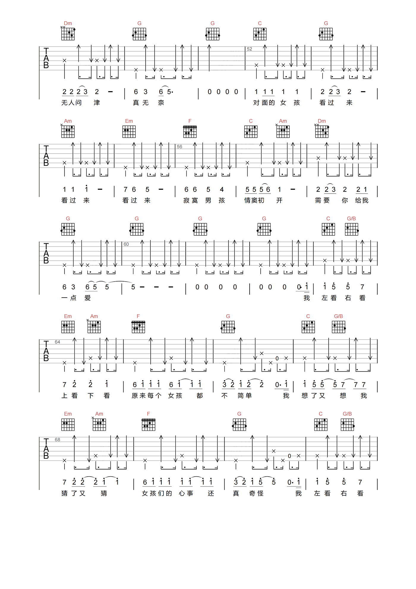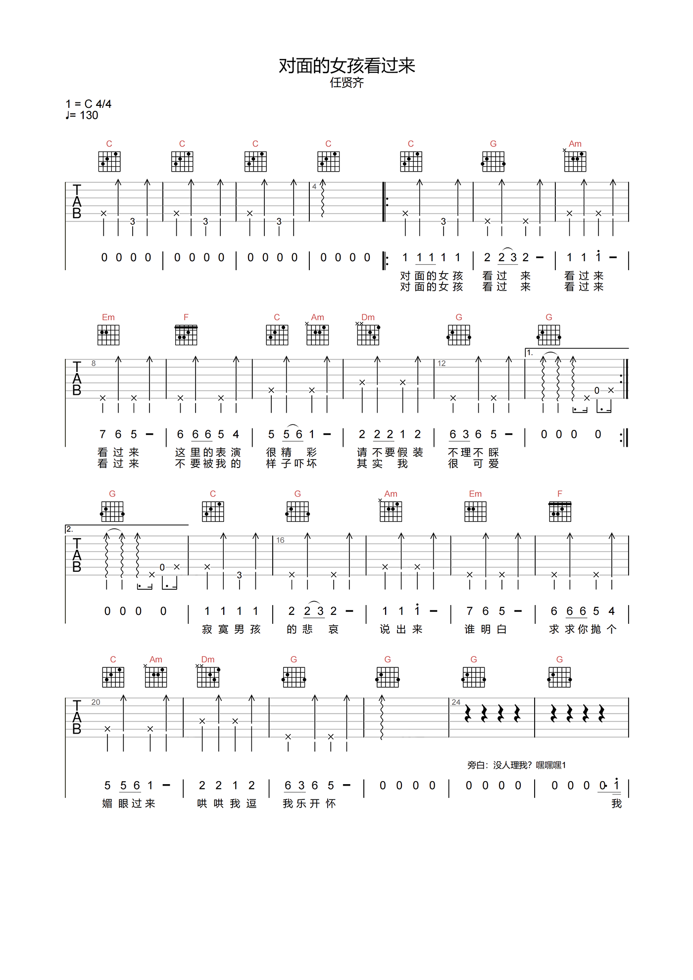曲谱介绍: 对面的女孩看过来吉他谱分享,任贤齐演唱的歌曲,轻松调侃的演唱形式曾征服过无数少男少女心,虽然时隔之久,而曲中依然可以找到熟悉的青春的味道,每当旋律响起,总会不由自主的放松下来。 《对面的女孩看过来》吉他弹唱谱,选用C调指法,原调编配,速度控制130拍每分钟,节奏拍号4/4,无需使用变调夹,随谱下方附曲谱PDF下载,琴谱网整理编辑上传。