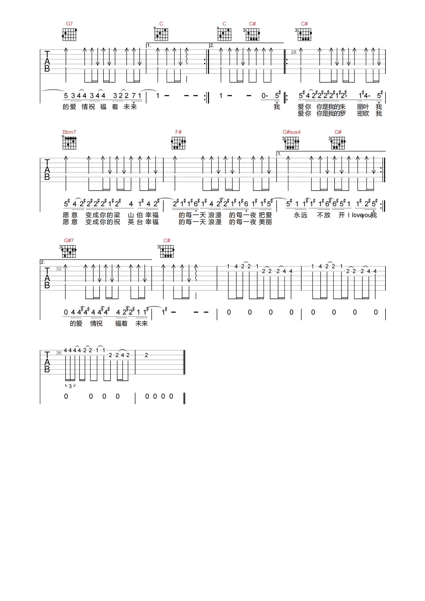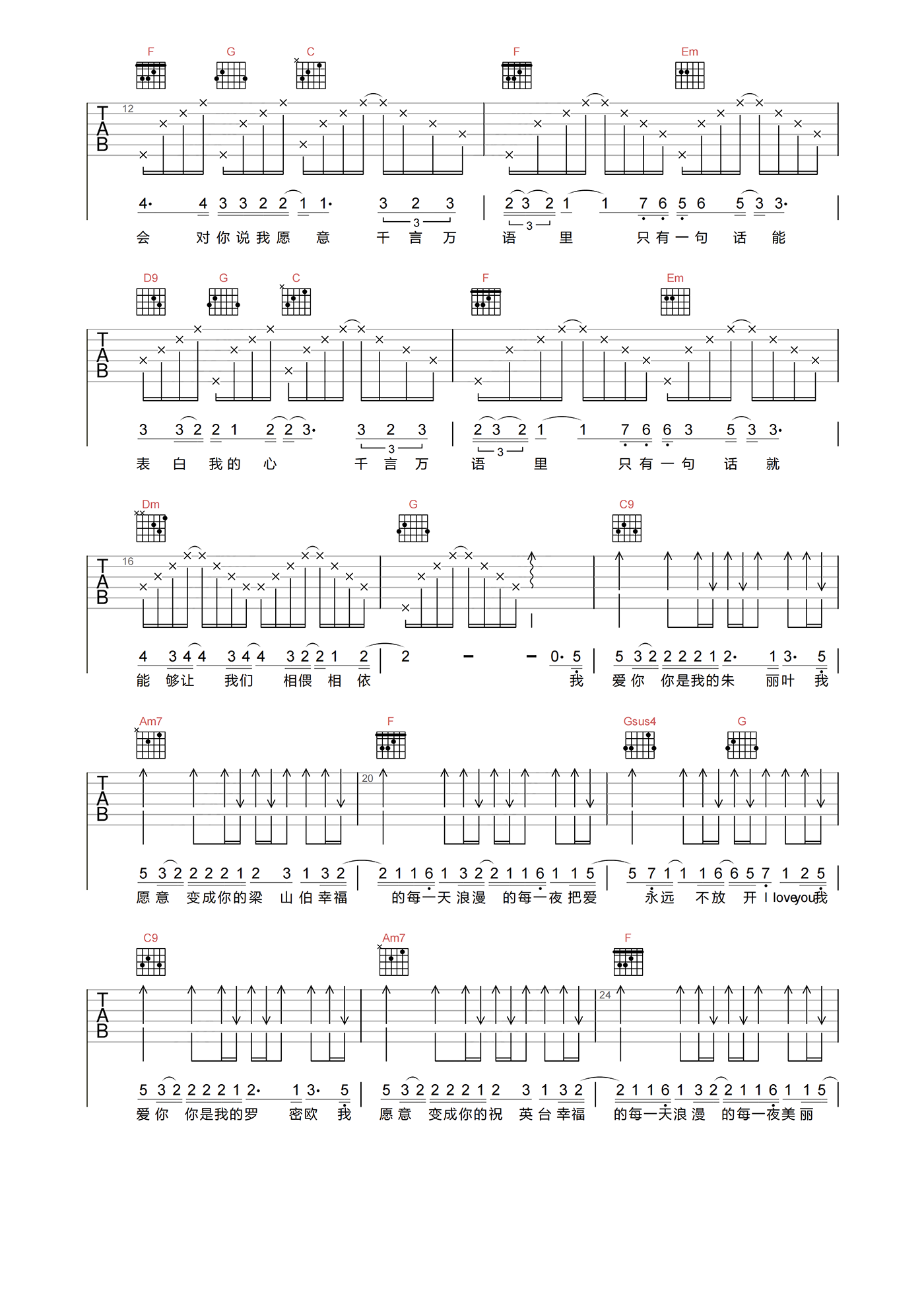 曲谱介绍: 梁山伯与朱丽叶吉他谱,曹格和卓文萱演唱的甜味情歌,《梁山伯与朱丽叶》吉他弹唱谱,选用C调指法,原调D调,节奏拍号4/4,速度控制在60拍每分钟,带前奏原版编配,由琴谱网整理编辑上传。 这歌拥有的2段被大家们传颂爱情的故事。梁山伯和祝英台作为国内经典的爱情小故事,变为表达爱情的流行曲子。