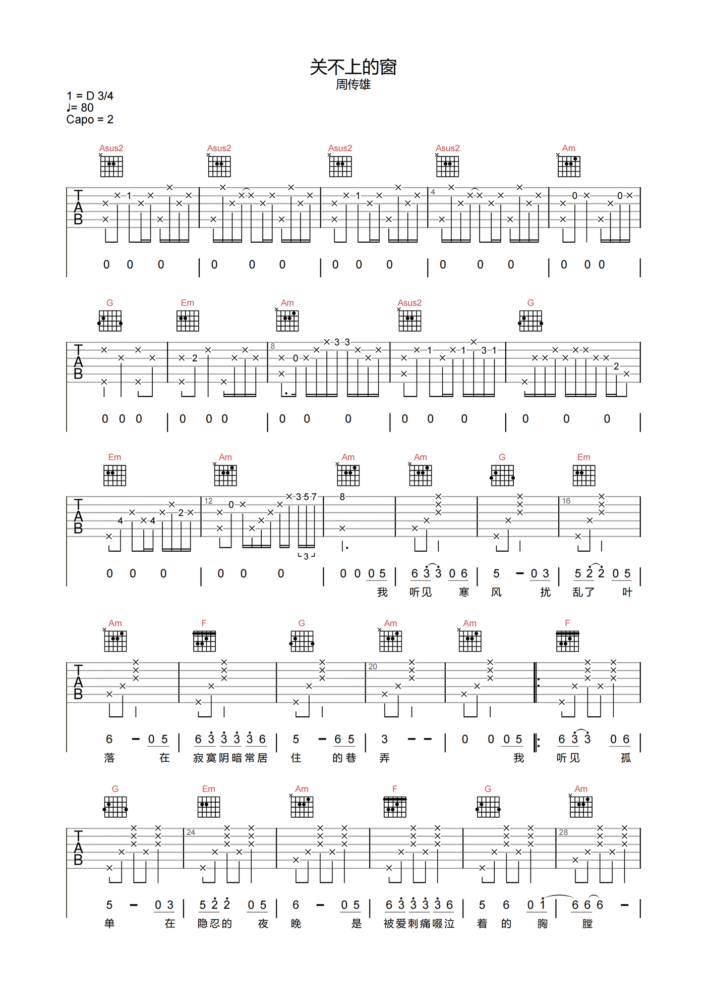 曲谱介绍: 周传雄《关不上的窗》吉他谱,选用C调指法,原调D调,变调夹建议夹2品弹唱原调,速度控制在80拍每分钟,节奏拍号3/4,带前奏原版编配,难度3级较简单,由琴谱网编辑整理上传。 失去爱情的无法理智,就像是“关不上的窗”,这首歌曲也是按照他多年的观察和经历体会,在爱中的失意的孤寂等候而生发的创作,通过歌曲想要治愈着被久封的心,但却无法修补失爱所带来的这样的伤疤。