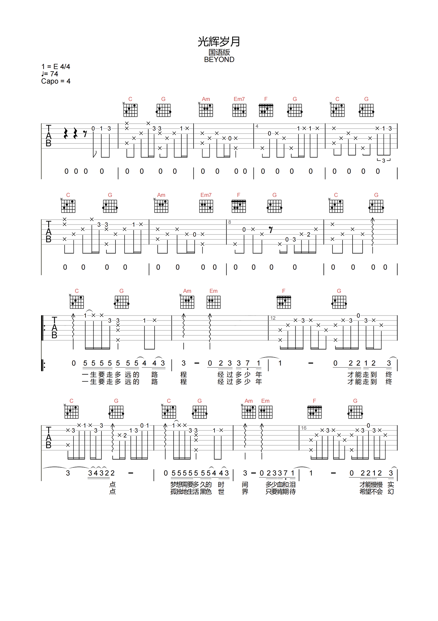 曲谱介绍: 光辉岁月吉他谱分享,BEYOND演唱,《光辉岁月》吉他弹唱谱,选用C调指法,原调E调,CAPO夹4品弹唱原调,节奏拍号4/4,速度74拍每分钟,带前奏原版编配,由琴谱网编辑整理上传。 这首歌主要表达了关于抗争与希望的主题,这正和他们当时在香港打拼的经历一样。然而国语版本相对来说是被大家传唱相对较少的,喜欢这个版本的赶紧收下吧。