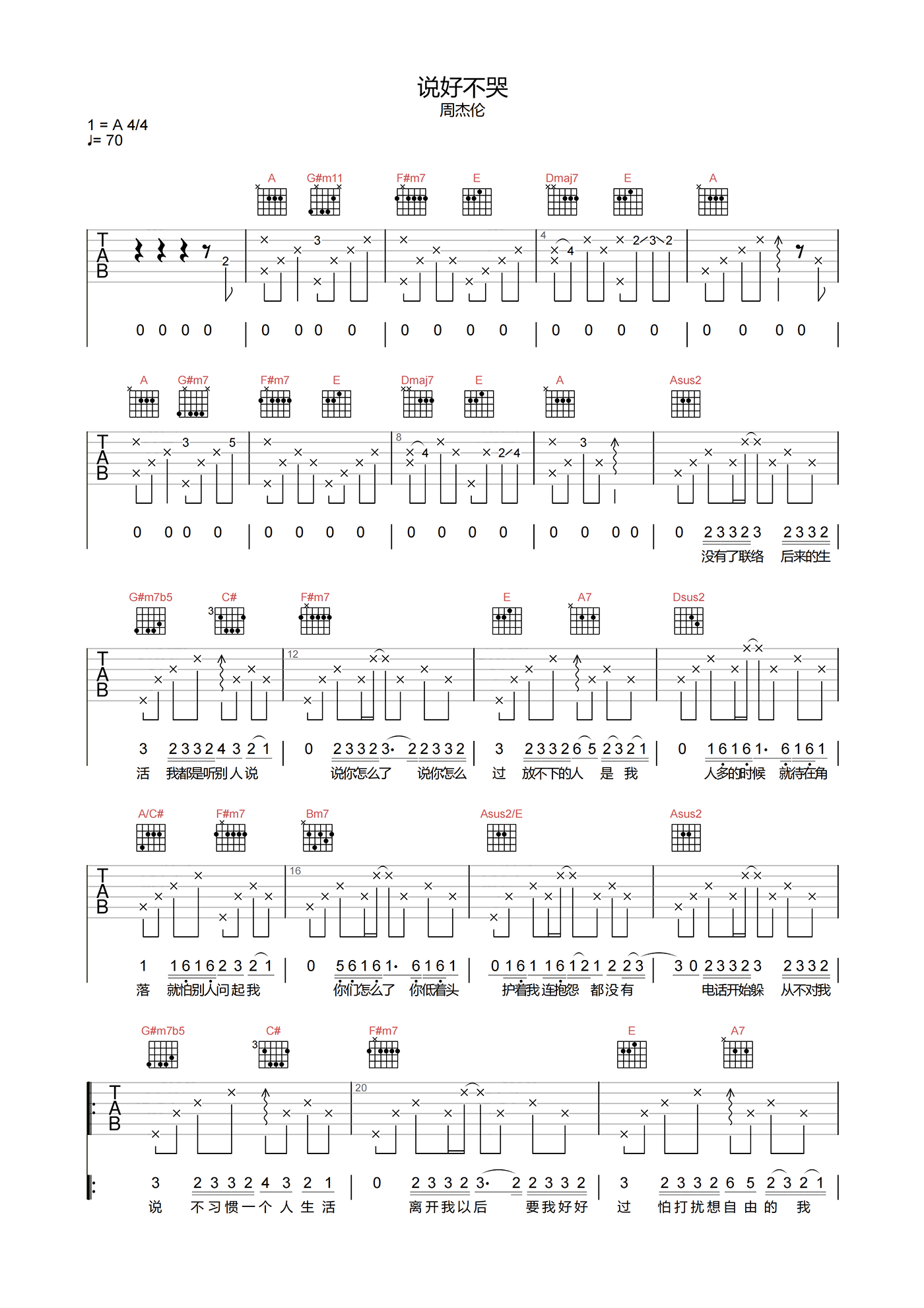 曲谱介绍: 周杰伦《说好不哭》吉他谱,由琴谱网整理上传。《说好不哭》吉他弹唱谱,选用A调指法,带前奏原调原版编配,速度控制在70拍每分钟,节奏拍号4/4,难度3级较简单,下方附曲谱PDF下载。 爱后的分手总是会充满无奈,最终都会为了去成全对方而坚定自己,原曲钢琴的主弦调,总能打开心灵的大门,营造出一种爱停格在分手时的那句说好不哭,但谁又能忍得住呢?