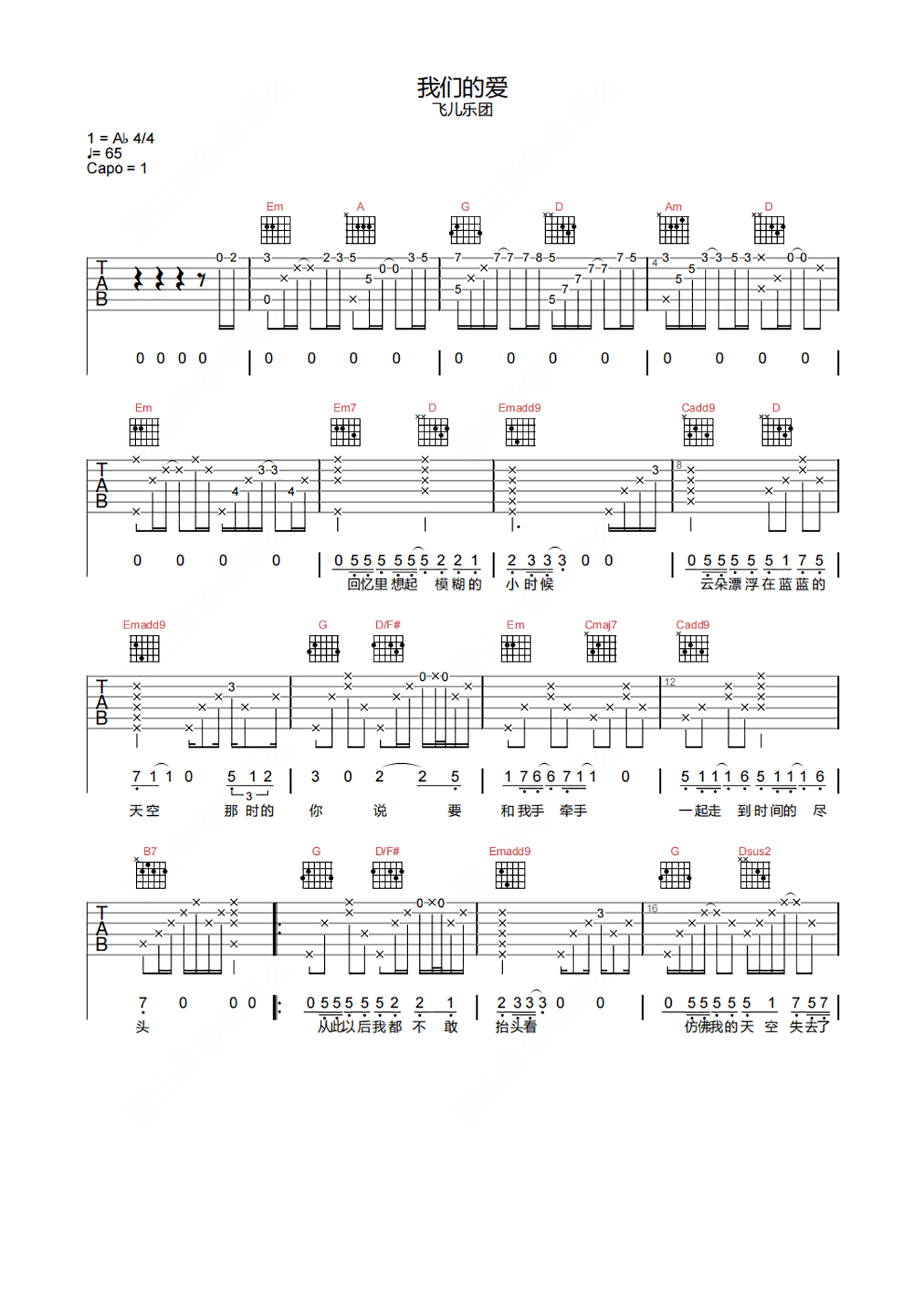 曲谱介绍: 飞儿乐团《我们的爱》吉他谱,选用G调指法,原调bA,节奏拍号4/4,速度65拍每分钟,带前奏完整原版编配,难度3级较简单,本吉他谱共有5张高清图片谱例,下方另附曲谱PDF下载。 作为出道即巅峰的飞儿乐团,这首歌有着十分大气附有张力的曲风,耐听且总是能深刻的触及心灵,正如歌曲所述“我们的爱”过了再也不回来,也告诉我们应当好好珍惜当下眼前的这段感情,错过的后悔永远来不及。