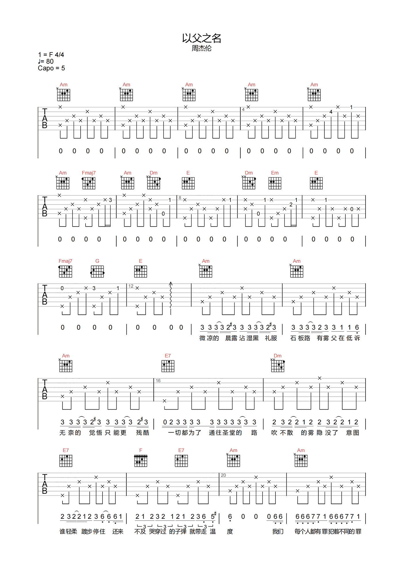 曲谱介绍: 以父之名吉他谱分享,周杰伦演唱的一首歌曲,《以父之名》吉他弹唱谱,选用C调指法,原调F调,节奏拍号4/4,速度控制在80拍每分钟,难度3级较简单,下方附曲谱PDF下载,由琴谱网编配整理。 音乐风格的古典RAP,以父亲的名义,意大利歌剧,无法预测的灵感。意大利祈祷独白营造了一种教父的氛围。女高音的歌唱增加了一种神秘感,充满层次感的弦乐和枪声急剧增加了画面感,让每个人都能看到一位纯洁的曾经和残酷而温柔的黑道教父。