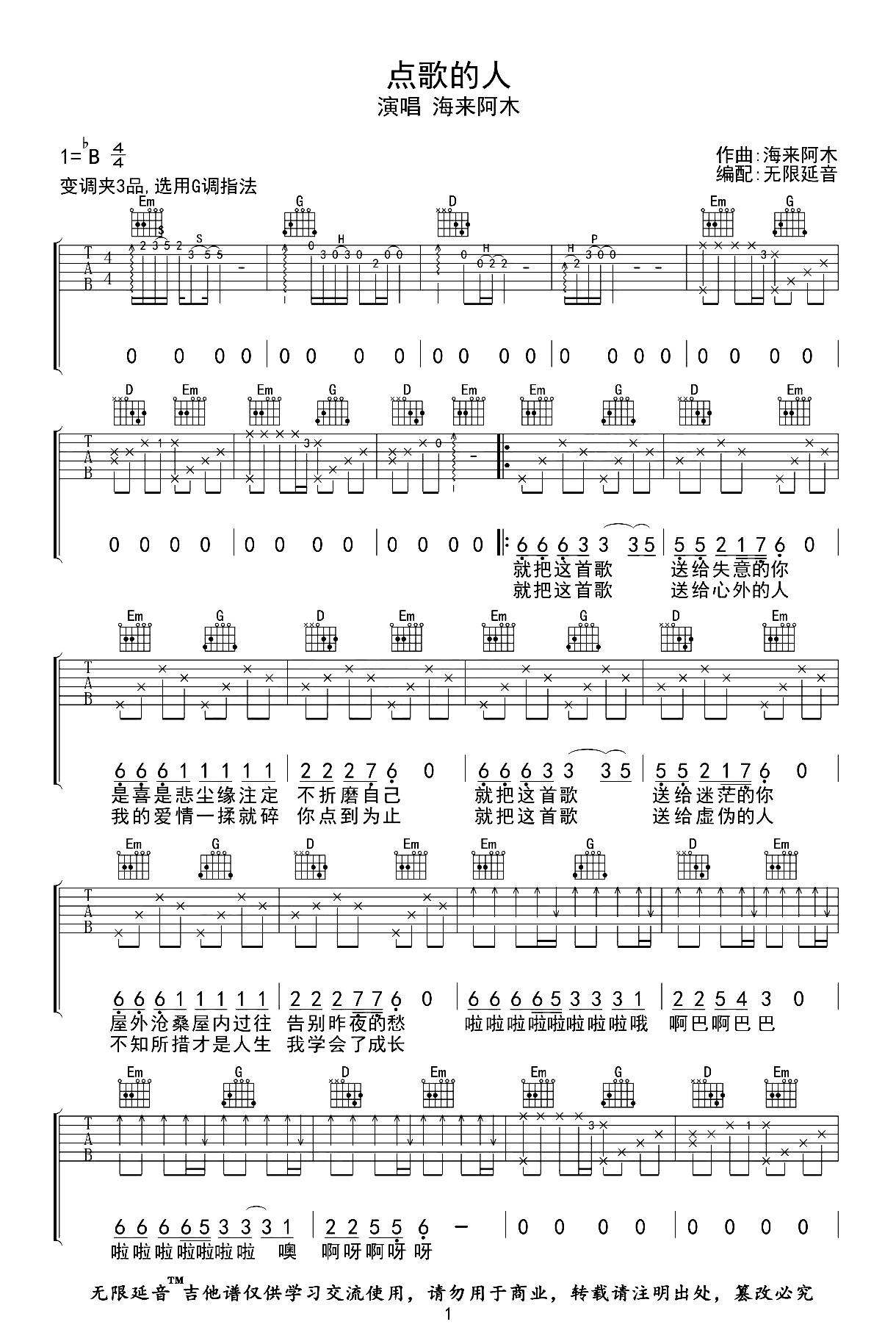 曲谱介绍: 海来阿木《点歌的人》吉他谱,由无限延音编配制谱,《点歌的人》吉他弹唱谱,选用G调指法,原调bB,节奏拍号4/4,共有2张高清六线谱图例,带前奏接近原版,难度3级较简单,由琴谱网编辑整理上传。 轻松活泼的节奏与旋律,歌声旋律优美而悦耳,治愈般的效果,听者入心,正如其意。写歌的角度正是需要切入听歌者的内心,仿佛一切的独白,正是为了更好的融入到听者的内心,当一切心事得以共鸣,正是最合适的作品。