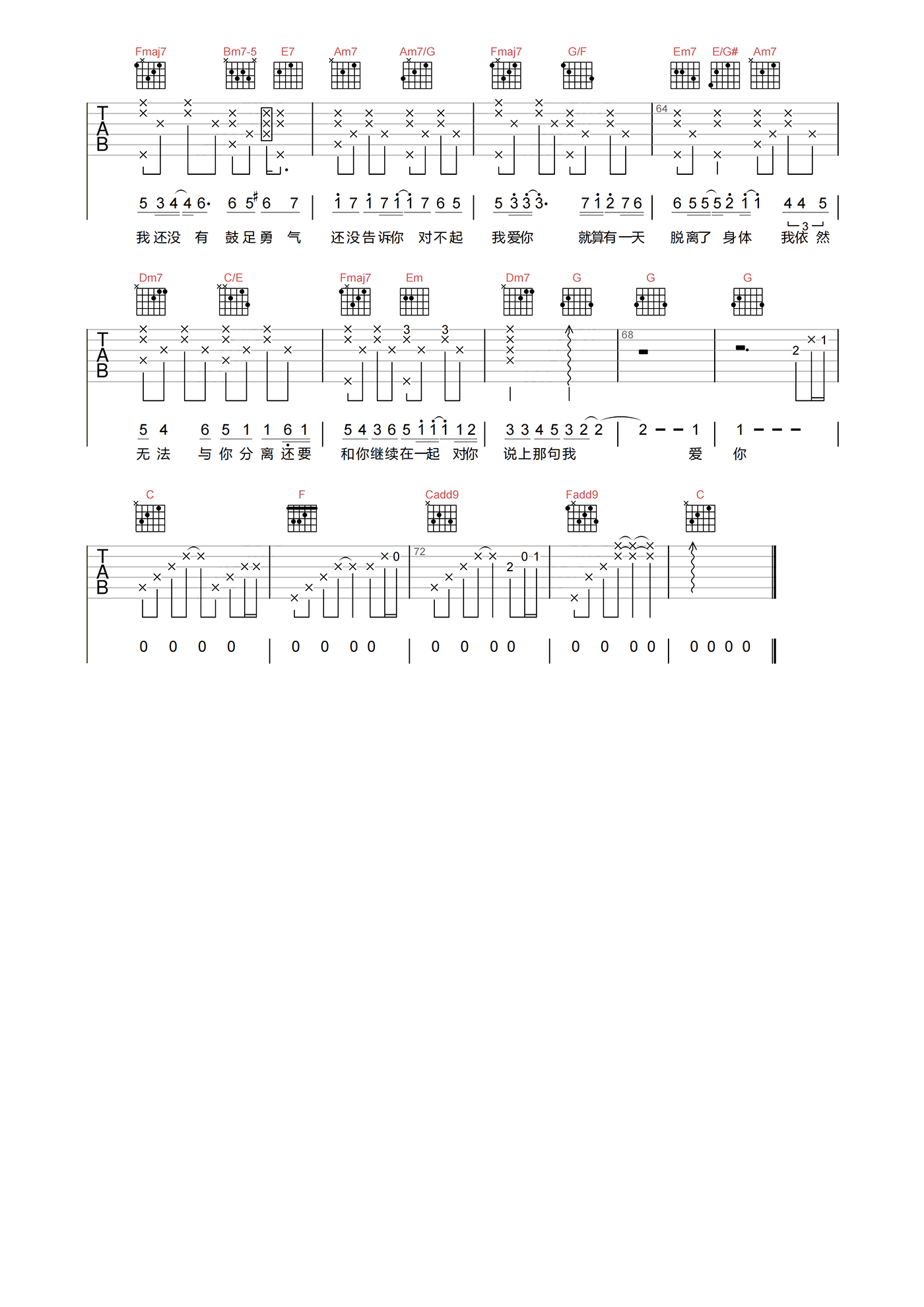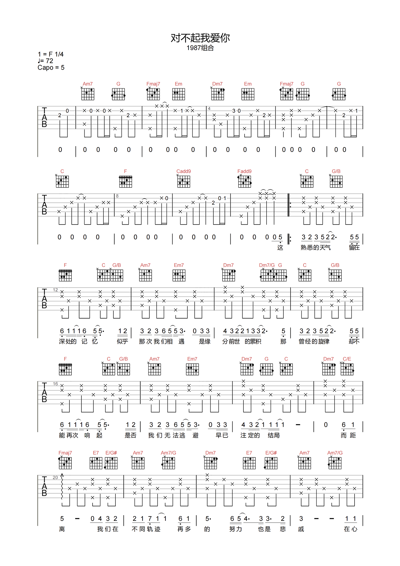 曲谱介绍: 对不起我爱你吉他谱分享,1983组合演唱的一首男声版歌曲。《对不起我爱你》吉他弹唱谱,选用C调指法,原调F,节奏拍号4/4,速度控制在72拍每分钟,带前奏完整原版编配,难度3级较简单,下方附吉他谱PDF下载。 这首中文歌曲改编自中岛美嘉的日文歌曲《雪之华》,其中被翻唱成了众多的中文版本歌曲,包括有蔡淳佳、韩雪、泳儿等歌手都进行过翻唱。舒缓优雅的旋律却透出了悲伤,诠释出了最后感情释然之时的倾心之情。