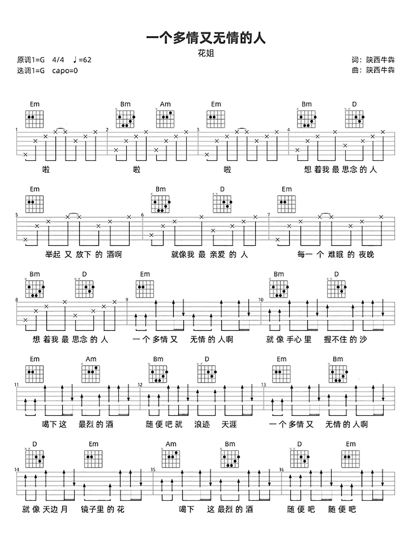 曲谱介绍: 一个多情又无情的人吉他谱,花姐演唱的一首歌曲,《一个多情又无情的人》吉他六线谱,选用G调指法,原调编配,速度控制在62拍每分钟,节奏拍号4/4,难度2级简单,本谱由琴谱网更新上传,共3张高清图片谱例,本页下方附吉他谱的PDF下载。