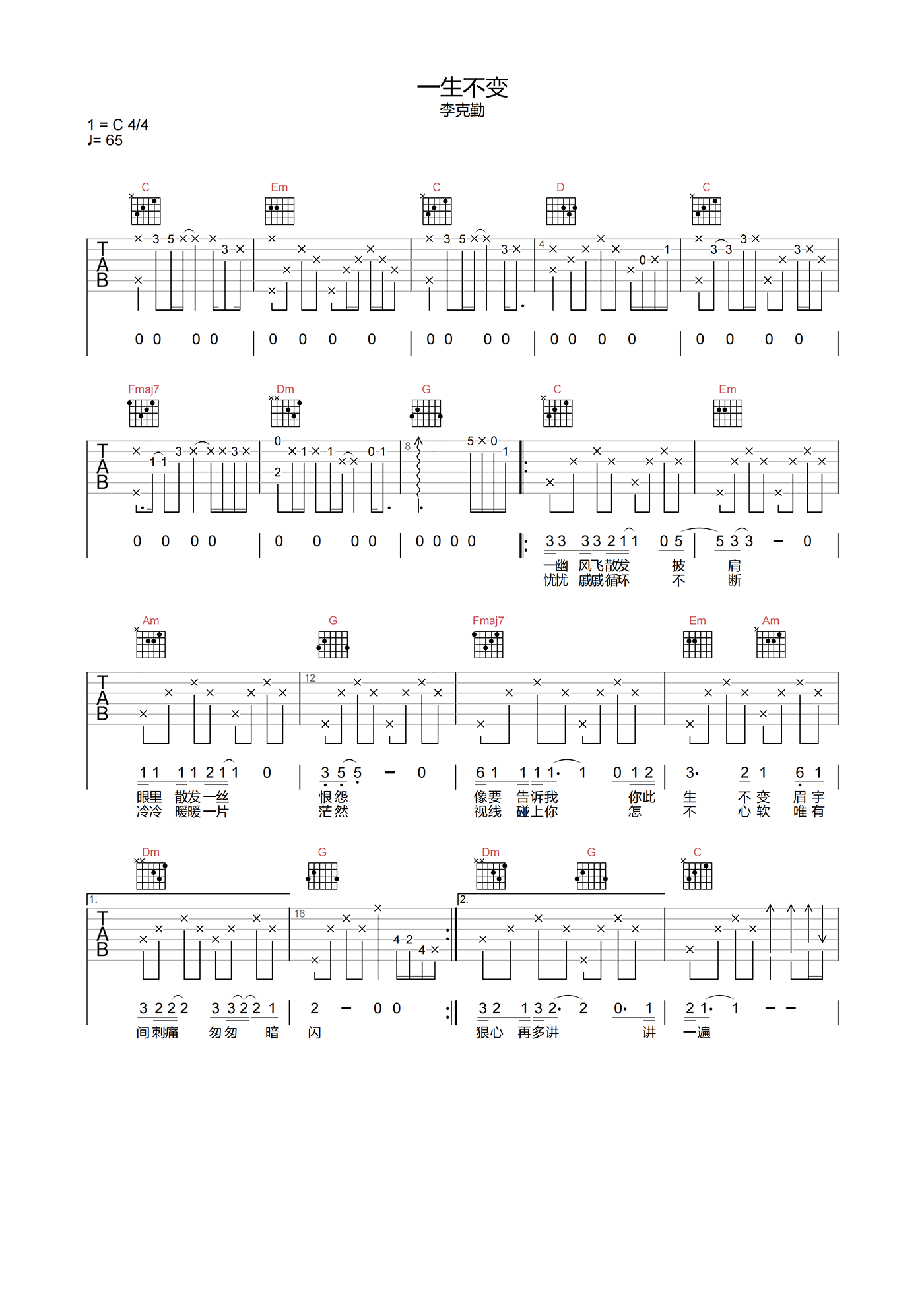 曲谱介绍: 一生不变吉他谱,李克勤演唱的一首经典粤语歌曲,《一生不变》吉他弹唱谱,选用C调指法,原调编配,可根据自己嗓音条件适当调整变调夹位置,节奏拍号4/4,速度65BPM,带前奏原版编配,共有3张高清六线谱图例,本谱由琴谱网更新上传,下方附本吉他谱PDF下载。