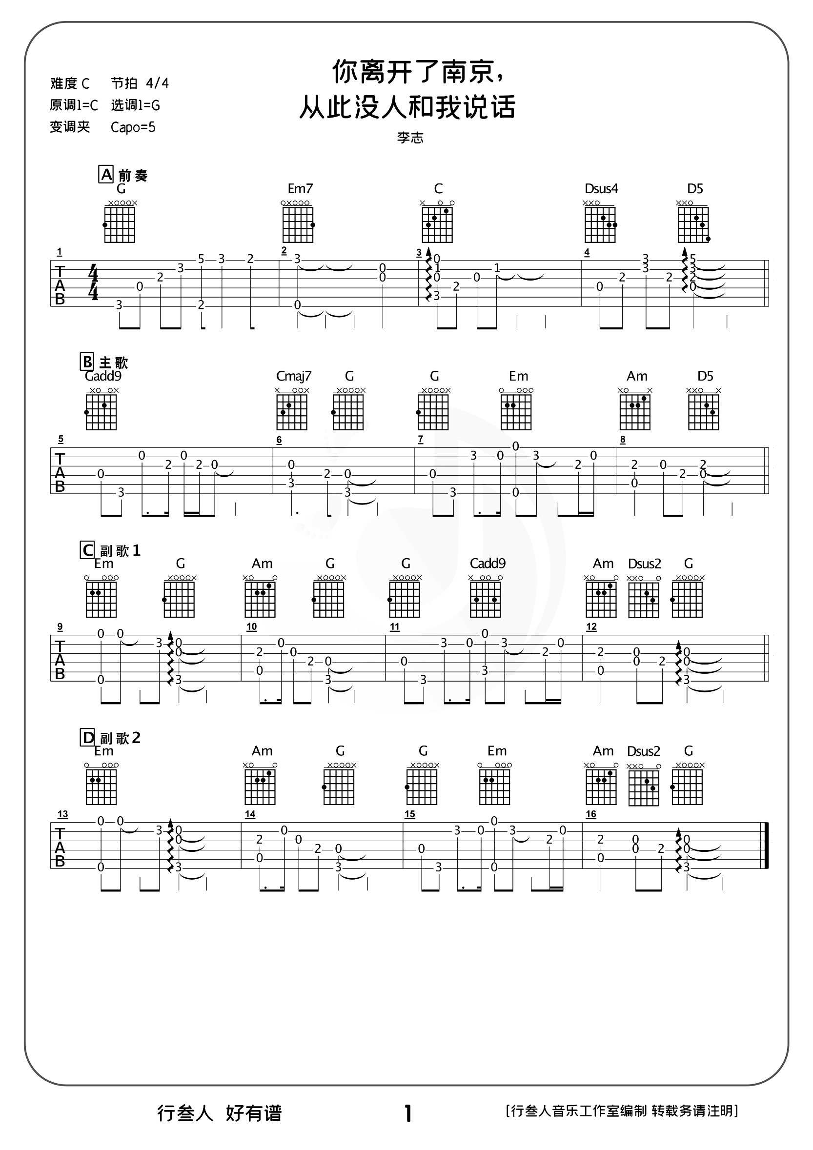 当前位置:琴谱网>吉他独奏>你离开了南京,从此没人和我说话