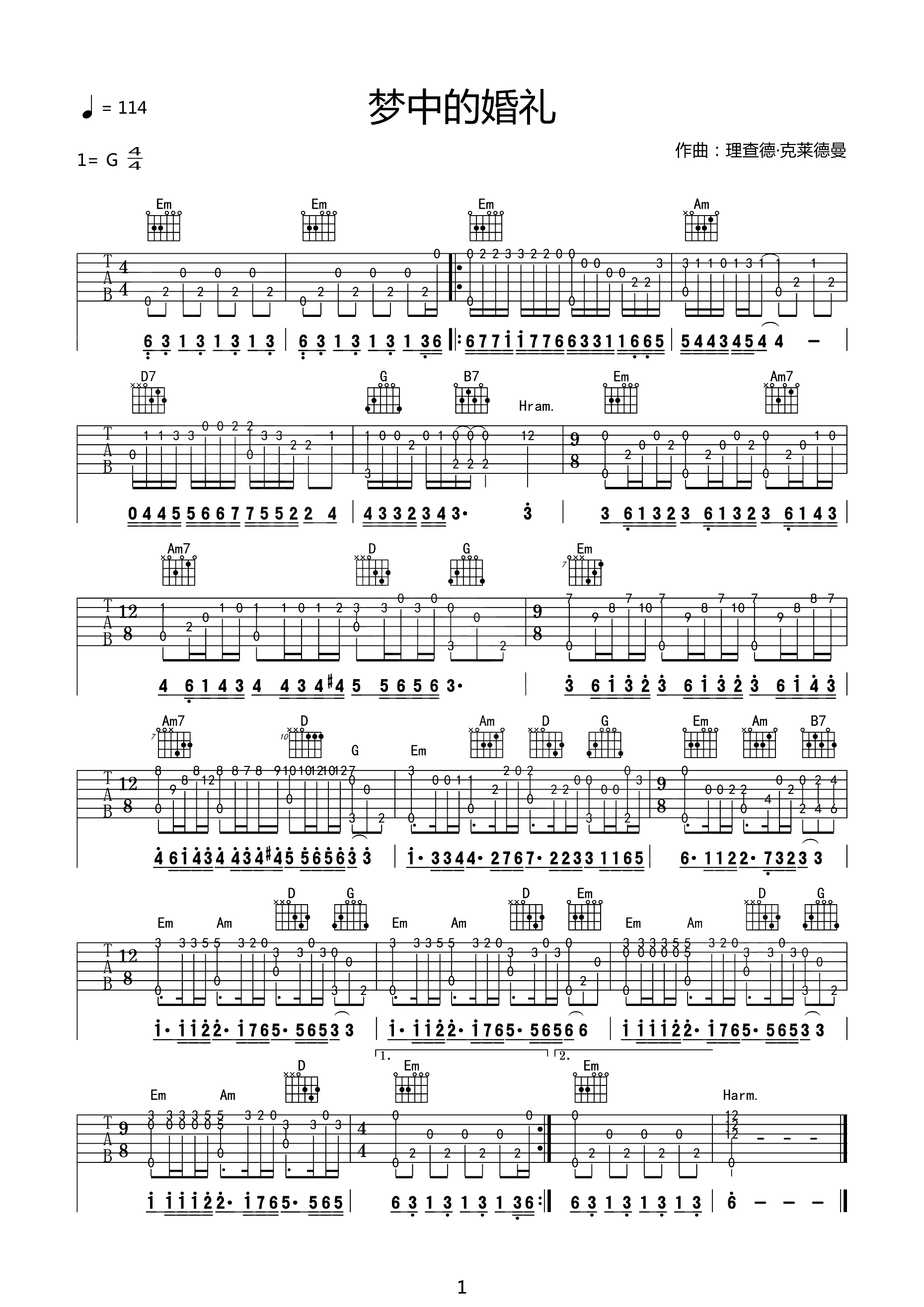 曲谱介绍: 梦中的婚礼指弹谱,是理查德·克莱德曼创作的著名钢琴曲目,选用G调指法编配,速度114拍每分钟,节奏4/4拍,没有太复杂的指弹技巧,需要熟练一下格子走位,共1张高清PNG六线谱。 优美的旋律如流水线般柔和,也如跳动的音符般具有灵动性,让人久听不腻,让我们再来回顾这个曲目的吉他独奏版本吧。 指弹谱详情