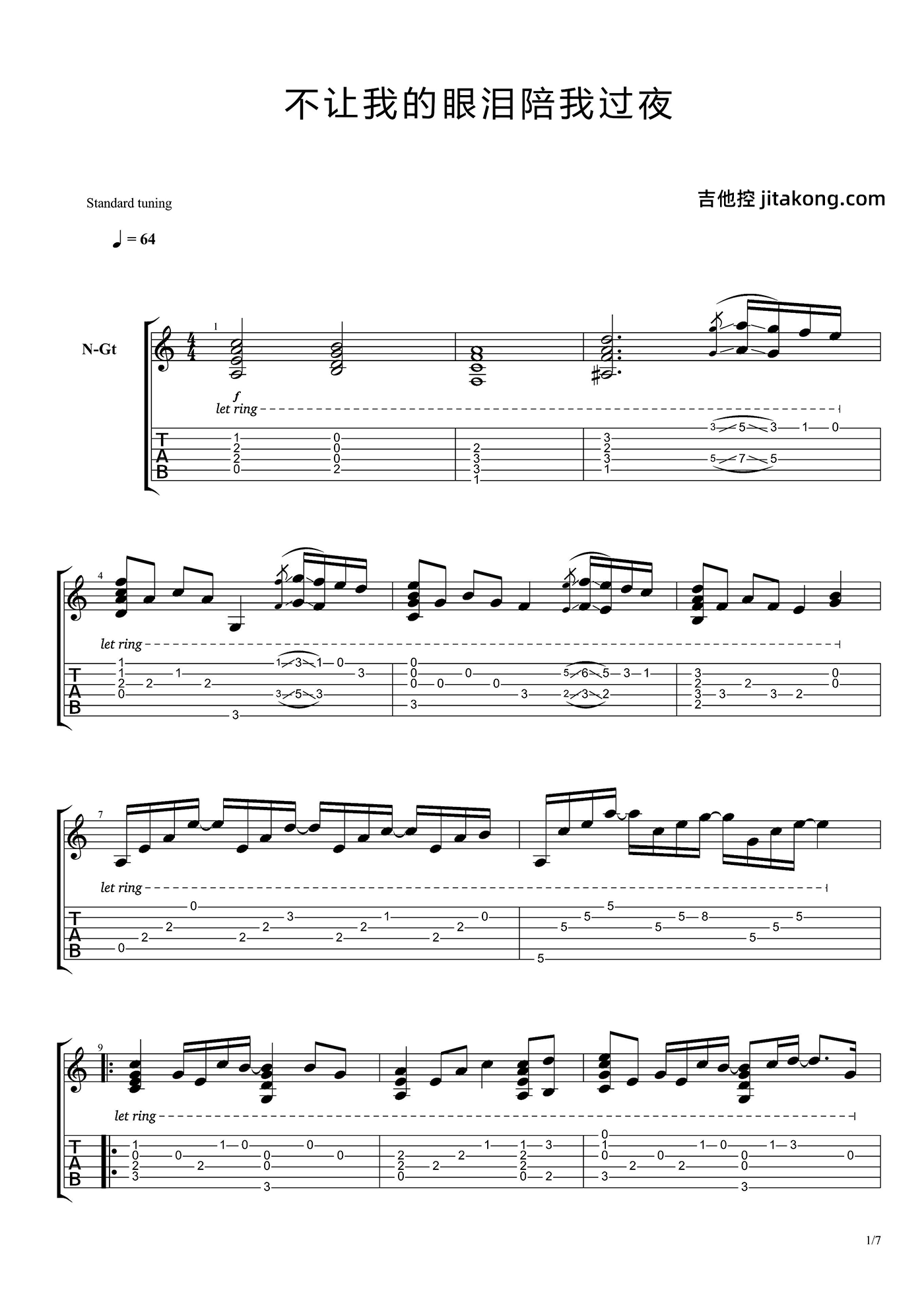 曲谱介绍: 不让我的眼泪陪我过夜指弹吉他谱,根据齐秦的伤感情歌所改编的指弹曲目,共有7张高清图片谱例,弹奏时速度控制在64拍每分钟,节奏4/4拍,指弹难度4级较简单。 指弹谱详情