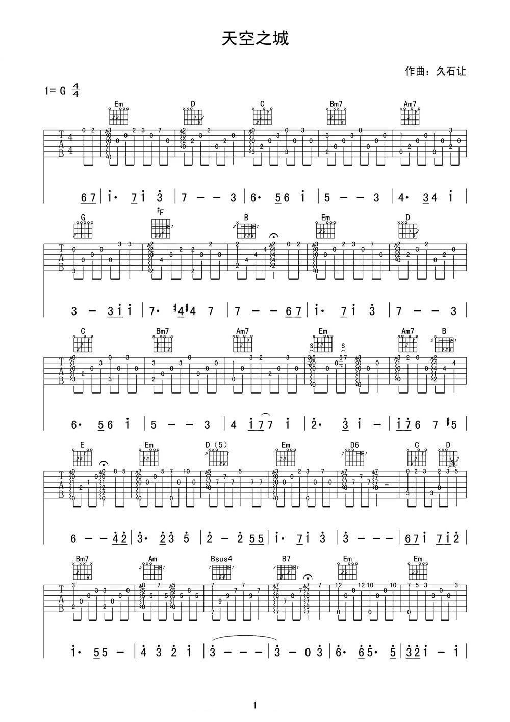 曲谱介绍: 天空之城指弹吉他谱,日本经典动画电影曲目,久石让的经典作品,选用G调指法,弹奏难度不算太大,节奏4.4拍,共2张高清PNG图片谱。 宫崎骏的动画作品之中,实属《天空之城》堪称经典,旋律优美而不腻,仿佛到了透亮的天空,配合这曲子画面感满满,可以说融合得太棒了! 指弹谱详情
