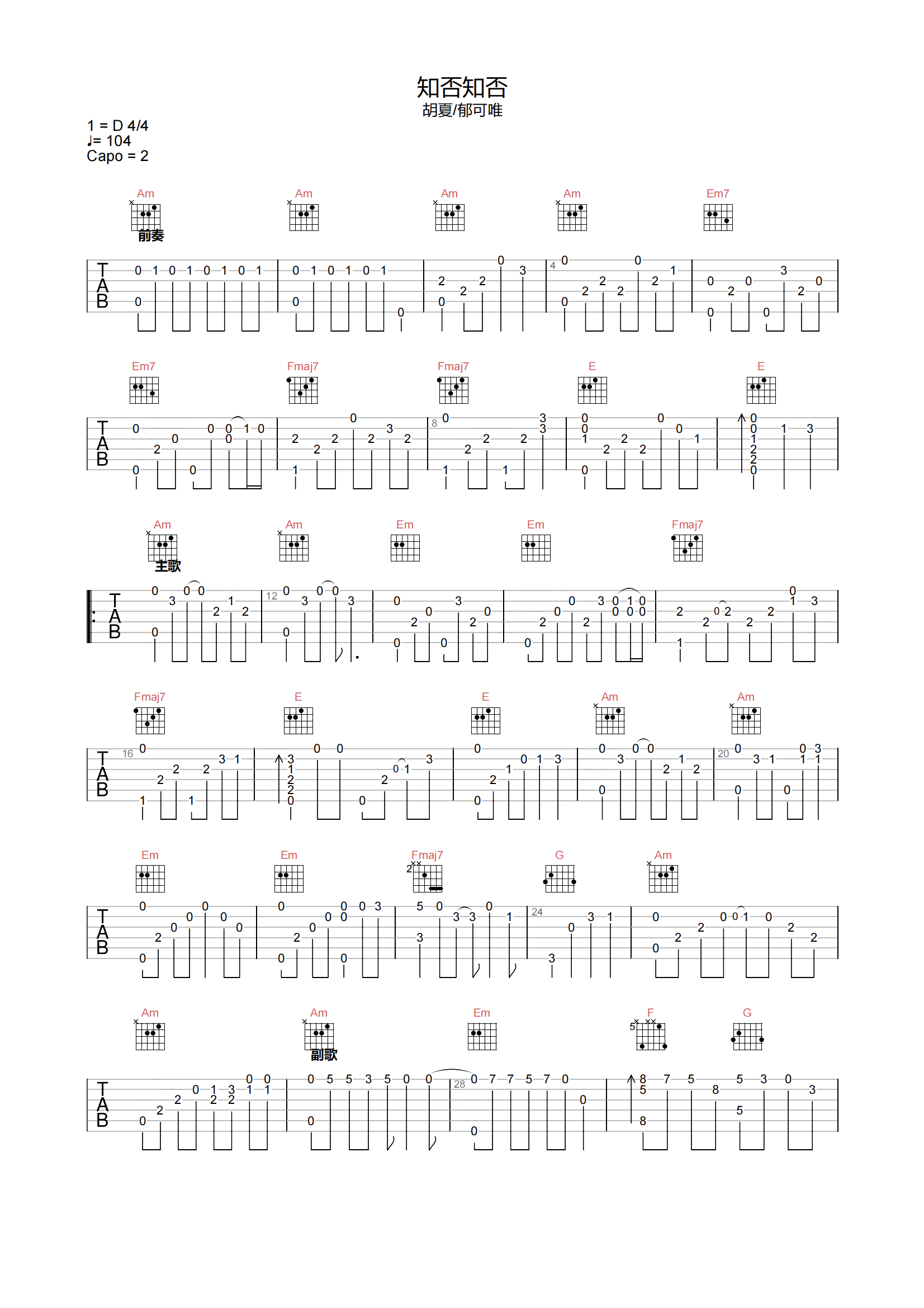 知否知否吉他谱 - 胡夏/郁可唯 - C调吉他独奏谱