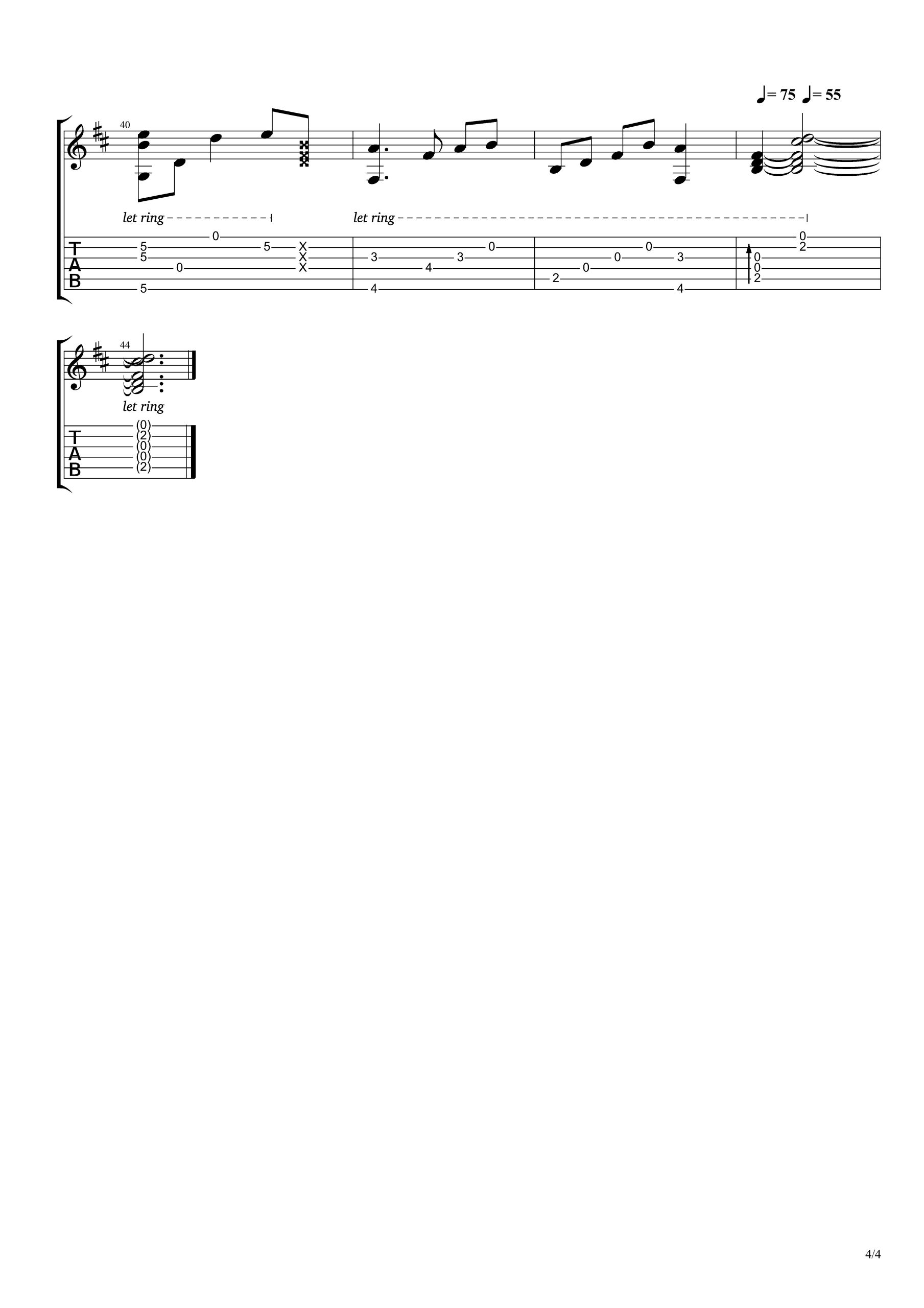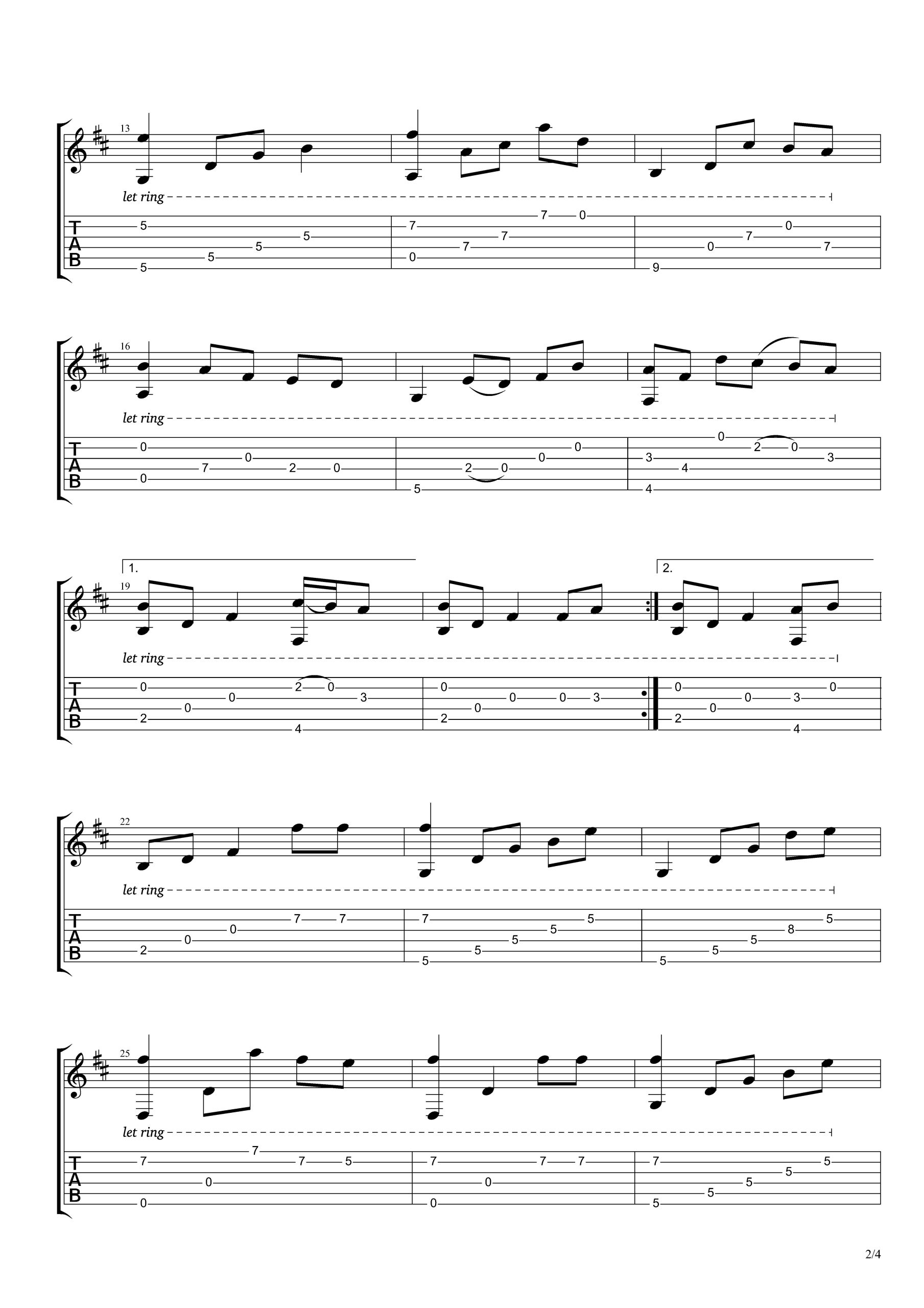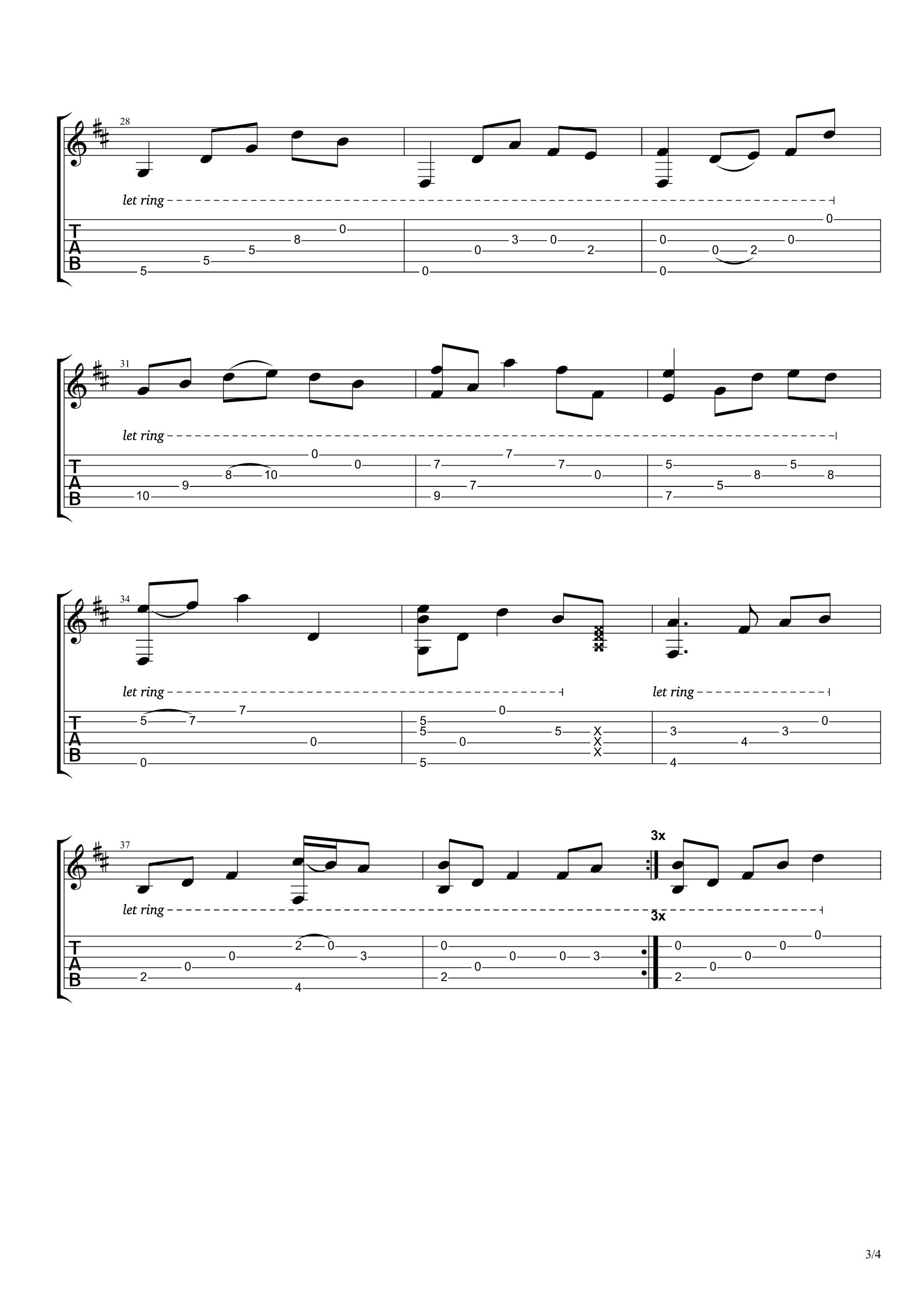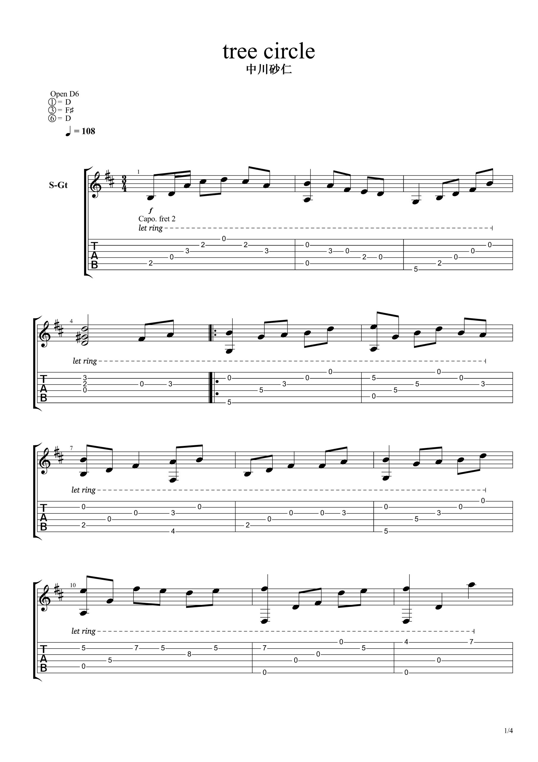 曲谱介绍: tree circle指弹谱,是中川砂仁的一首吉他独奏曲目,曲调优美舒缓,听着有一种不错的舒适感,让人顿时心旷神怡,回到大自然。 本曲谱共有4张高清图片谱,速度控制在108拍每分钟,节奏3/4拍,指弹难度3级较简单。 指弹谱详情