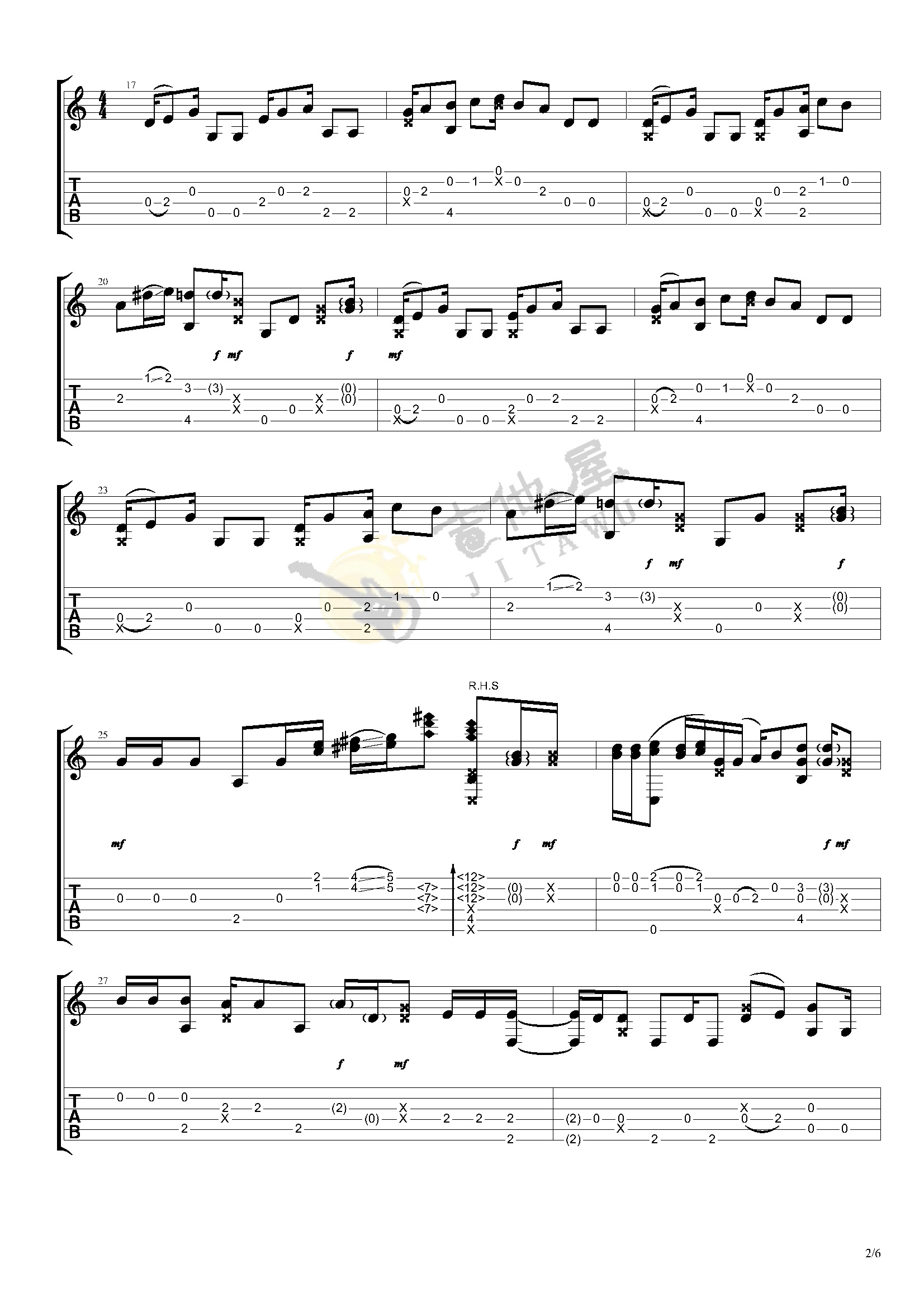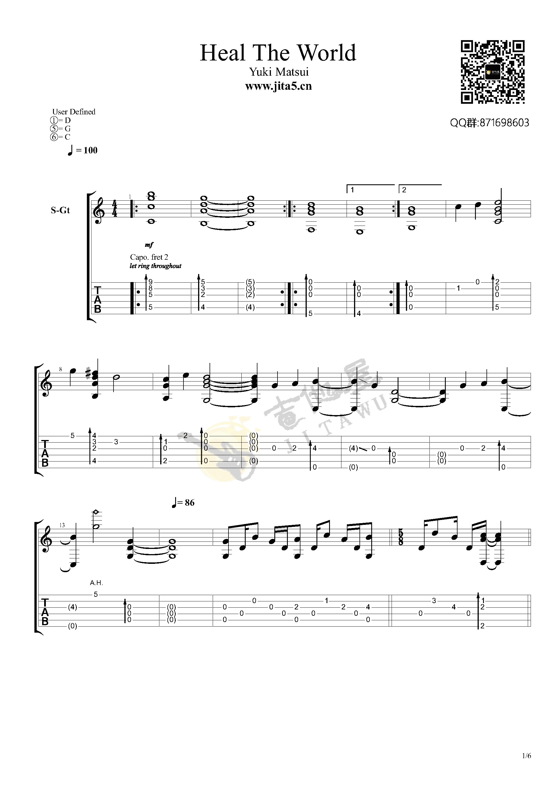 曲谱介绍: 吉他谱介绍:Heal-The-World指弹吉他谱,松井佑贵的一首指弹吉他曲目,这首曲子采用的是特殊调弦,4/4拍的节奏,练习之前6根琴弦需要调到对应的音,曲谱上有标注,注意调音过程中不要断弦。小技巧:琴弦振动过程中不要调音,用手制音之后再旋转弦钮,会大大降低断弦的几率。演奏时可不夹变调夹,曲谱由琴谱网更新上传,共6张高清图片指弹吉他谱例,曲谱来源于网络转载,编配制谱者暂不详。同样和很多日系指弹一样也是一首特殊调弦的曲子,松井佑贵演奏的版本,指法其实难度还是有一些的,需要多花时间去磕。特殊调弦只需要将156弦分别调到D、G、C即可。