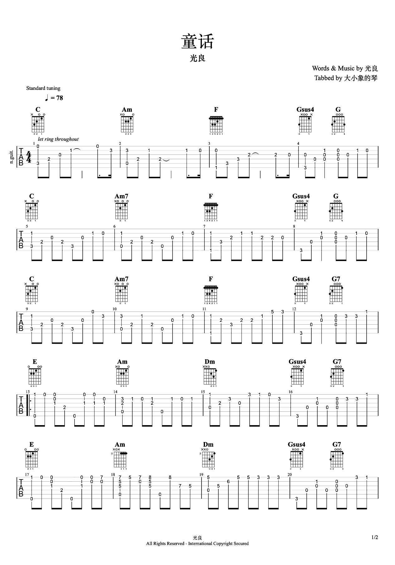 童话吉他谱 - 光良 - C调吉他独奏谱